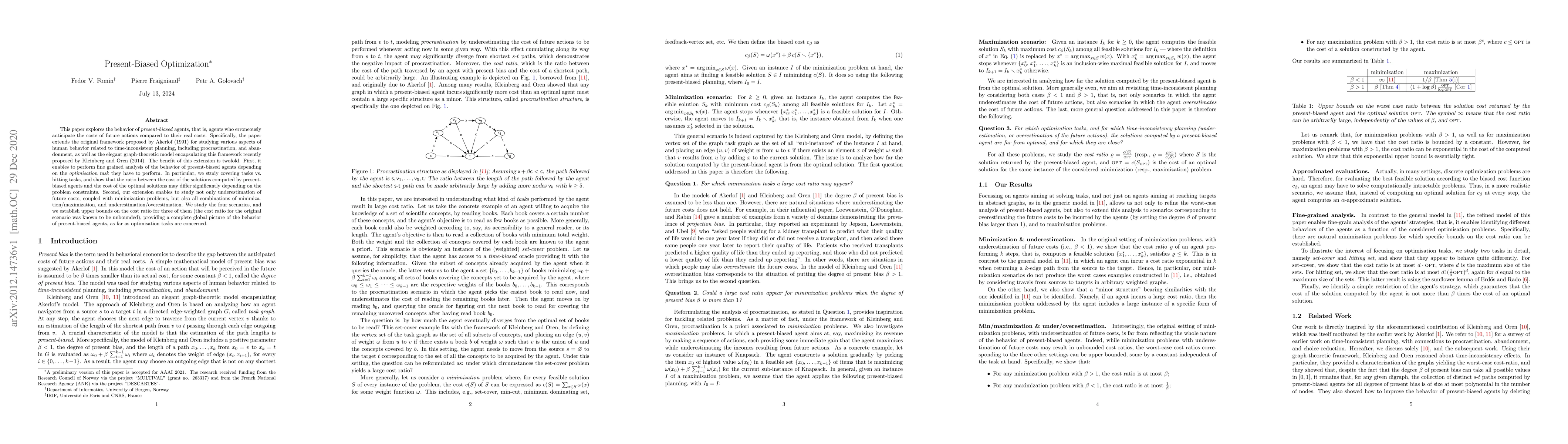 This paper explores the behavior of present-biased agents, that is, agents who erroneously anticipate the costs of future actions compared to their real costs. Specifically, the paper extends the original framework proposed by Akerlof (1991) for studying various aspects of human behavior related to time-inconsistent planning, including procrastination, and abandonment, as well as the elegant graph-theoretic model encapsulating this framework recently proposed by Kleinberg and Oren (2014). The benefit of this extension is twofold. First, it enables to perform fine grained analysis of the behavior of present-biased agents depending on the optimisation task they have to perform. In particular, we study covering tasks vs. hitting tasks, and show that the ratio between the cost of the solutions computed by present-biased agents and the cost of the optimal solutions may differ significantly depending on the problem constraints. Second, our extension enables to study not only underestimation of future costs, coupled with minimization problems, but also all combinations of minimization/maximization, and underestimation/overestimation. We study the four scenarios, and we establish upper bounds on the cost ratio for three of them (the cost ratio for the original scenario was known to be unbounded), providing a complete global picture of the behavior of present-biased agents, as far as optimisation tasks are concerned.