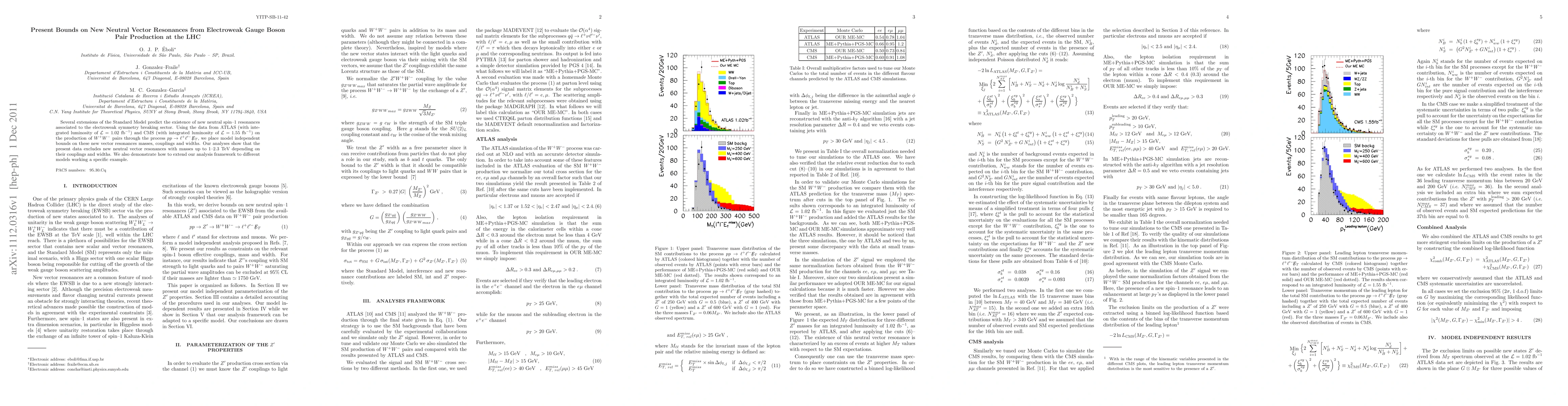 Several extensions of the Standard Model predict the existence of new neutral spin-1 resonances associated to the electroweak symmetry breaking sector. Using the data from ATLAS (with integrated luminosity of L=1.02 fb^{-1}) and CMS (with integrated luminosity of L=1.55 fb^{-1}) on the production of W+W- pairs through the process pp -> l^+ l^{\prime -} \sla{E}_T, we place model independent bounds on these new vector resonances masses, couplings and widths. Our analyses show that the present data excludes new neutral vector resonances with masses up to 1-2.3 TeV depending on their couplings and widths. We also demonstrate how to extend our analysis framework to different models working a specific example.