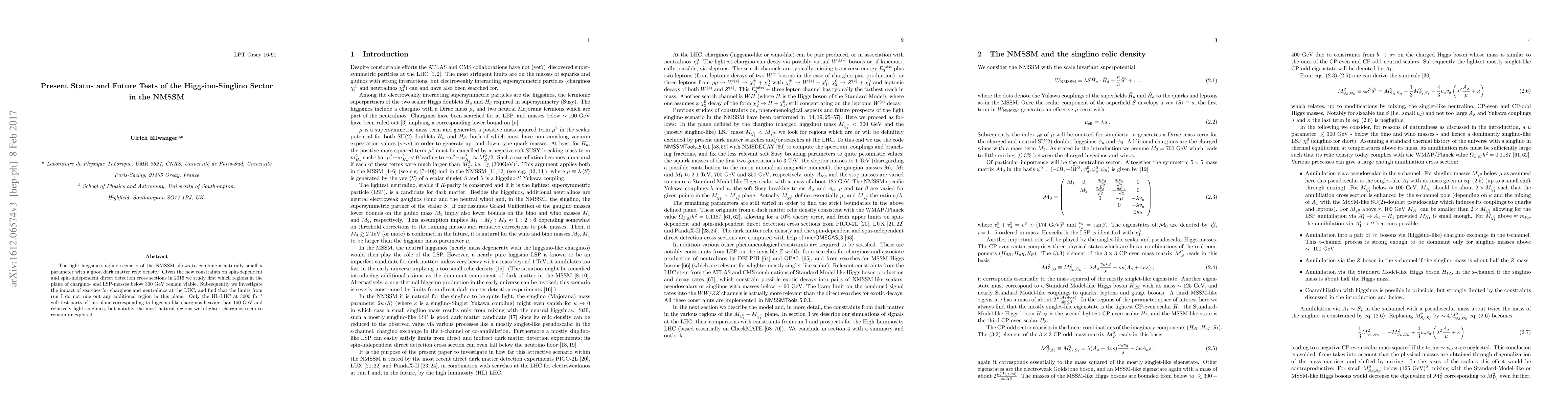 The light higgsino-singlino scenario of the NMSSM allows to combine a naturally small $\mu$ parameter with a good dark matter relic density. Given the new constraints on spin-dependent and spin-independent direct detection cross sections in 2016 we study first which regions in the plane of chargino- and LSP-masses below 300 GeV remain viable. Subsequently we investigate the impact of searches for charginos and neutralinos at the LHC, and find that the limits from run I do not rule out any additional region in this plane. Only the HL-LHC at 3000 fb$^{-1}$ will test parts of this plane corresponding to higgsino-like charginos heavier than 150 GeV and relatively light singlinos, but notably the most natural regions with lighter charginos seem to remain unexplored.