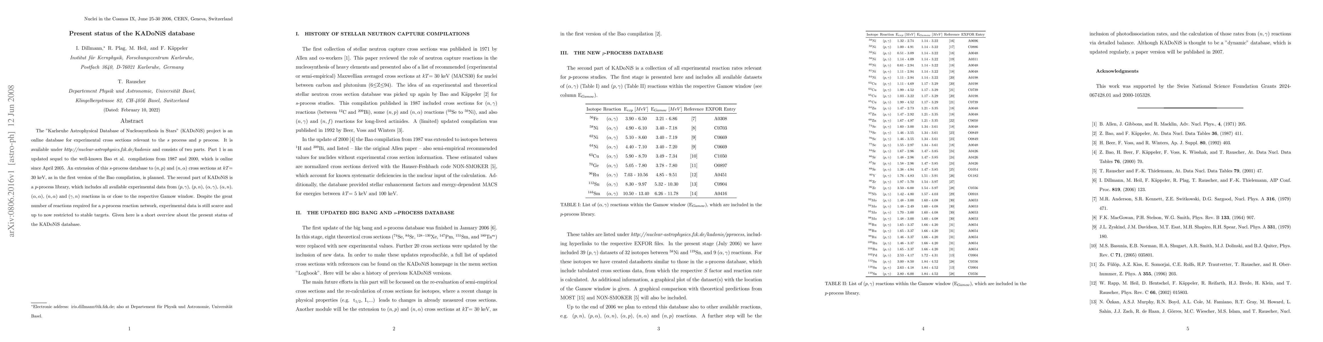The "Karlsruhe Astrophysical Database of Nucleosynthesis in Stars" (KADoNiS) project is an online database for experimental cross sections relevant to the $s$ process and $p$ process. It is available under \http://nuclear-astrophysics.fzk.de/kadonis and consists of two parts. Part 1 is an updated sequel to the well-known Bao et al. compilations from 1987 and 2000, which is online since April 2005. An extension of this $s$-process database to $(n,p)$ and $(n,\alpha)$ cross sections at $kT$= 30 keV, as in the first version of the Bao compilation, is planned. The second part of KADoNiS is a $p$-process library, which includes all available experimental data from $(p,\gamma)$, $(p,n)$, $(\alpha,\gamma)$, $(\alpha,n)$, $(\alpha,\alpha)$, $(n,\alpha)$ and $(\gamma,n)$ reactions in or close to the respective Gamow window. Despite the great number of reactions required for a $p$-process reaction network, experimental data is still scarce and up to now restricted to stable targets. Given here is a short overview about the present status of the KADoNiS database.