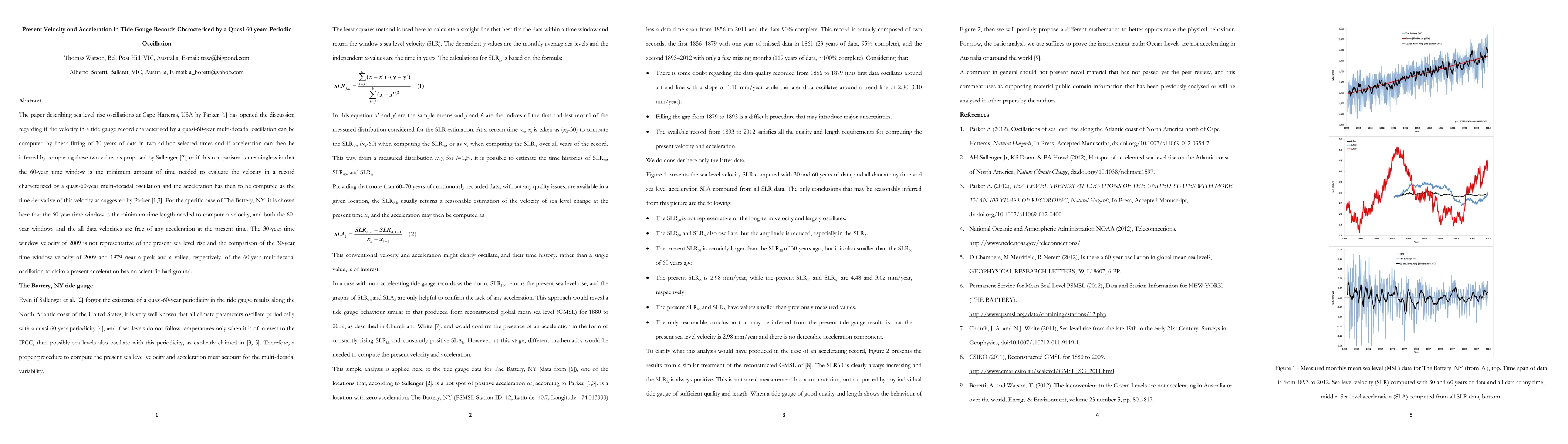 This paper examines the computation of sea level rise velocity and acceleration in tide gauge records showing a quasi-60-year oscillation, concluding that a 60-year time window is necessary to accurately determine velocity, and that acceleration cannot be inferred from a 30-year comparison. The study at The Battery, NY, finds no present acceleration in the tide gauge data.