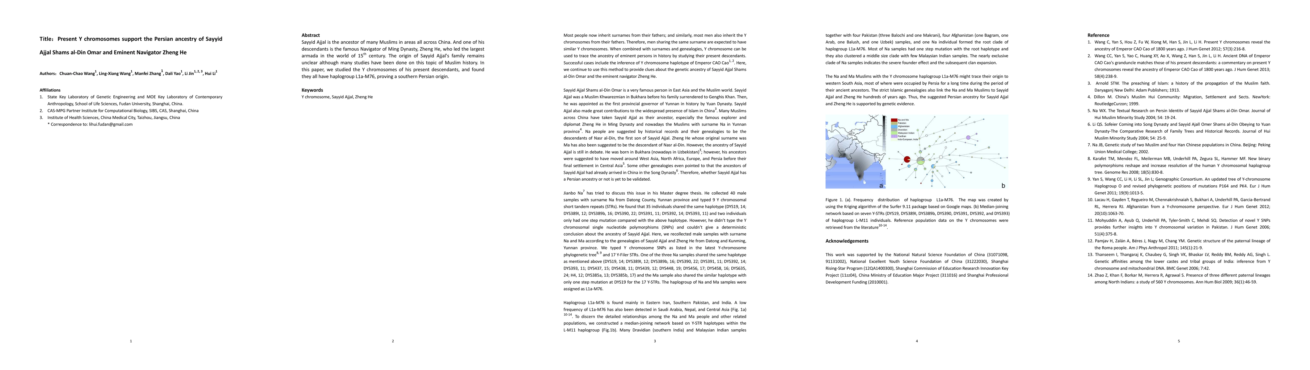 This study analyzes the Y chromosomes of present-day descendants of Sayyid Ajjal Shams al-Din Omar, revealing haplogroup L1a-M76, which supports their Persian ancestry. This finding also connects the lineage to the famous navigator Zheng He of the Ming Dynasty.