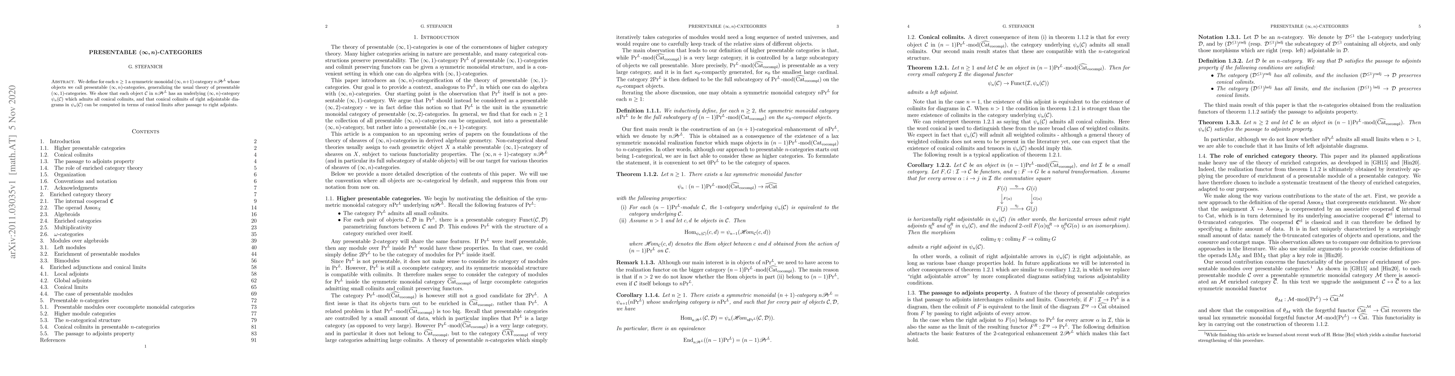 This paper introduces symmetric monoidal $(\infty, n+1)$-categories $n\mathrm{Pr}^L$ for $n \geq 1$, termed presentable $(\infty, n)$-categories, extending the concept of presentable $(\infty,1)$-categories. It demonstrates that these objects admit conical colimits and that right adjointable diagrams in them can be evaluated through conical limits after applying right adjoints.