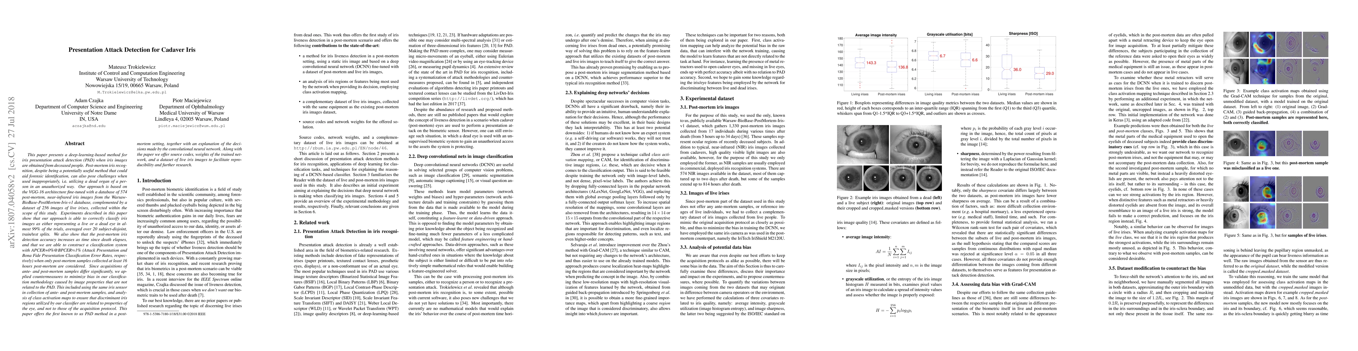 This paper introduces a deep-learning-based method for detecting presentation attacks in cadaver iris images using a fine-tuned VGG-16 architecture, achieving nearly 99% accuracy in distinguishing live from post-mortem irises. The approach also minimizes bias from acquisition differences and offers a dataset and trained model for reproducibility.
