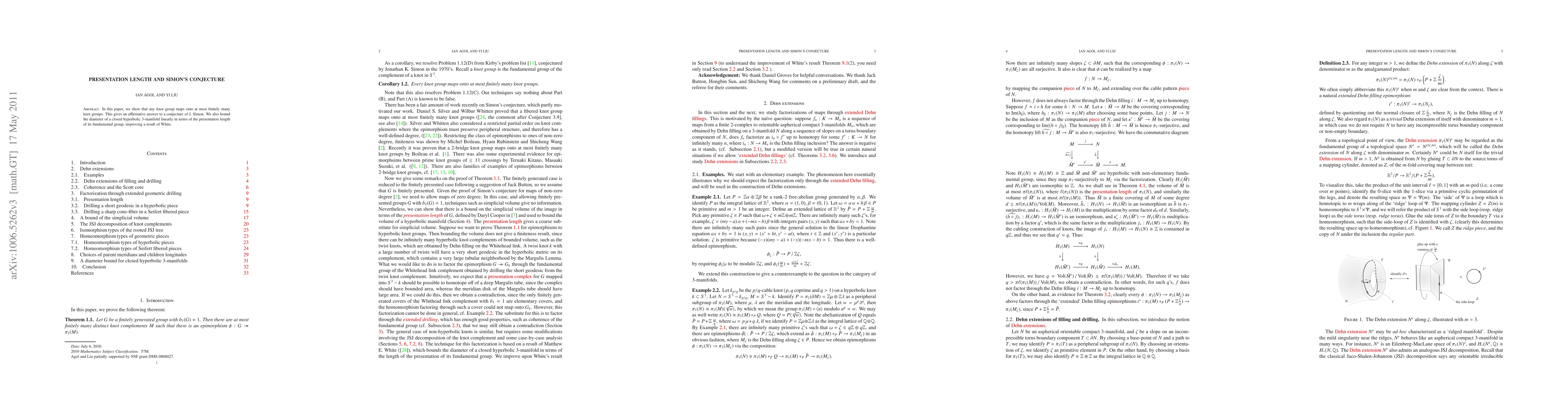 This paper confirms that any knot group can map onto at most finitely many knot groups, thus validating a conjecture by J. Simon. Additionally, it provides a linear bound on the diameter of closed hyperbolic 3-manifolds based on the presentation length of their fundamental groups, enhancing a previous result by White.
