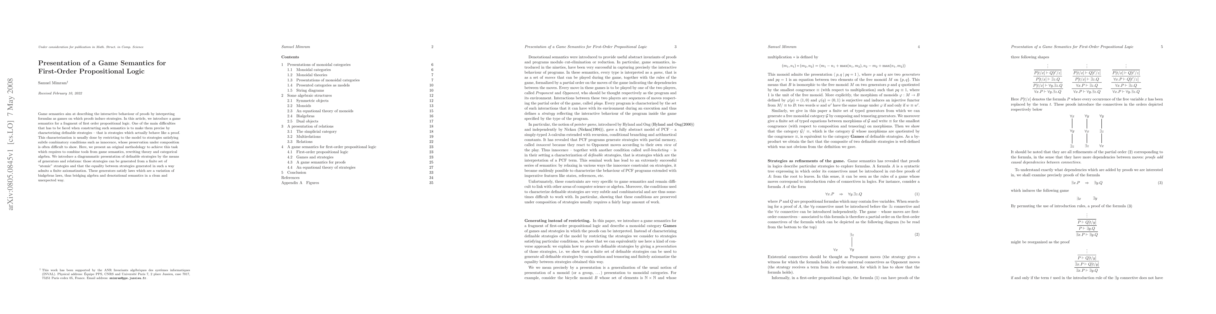 This paper presents a novel game semantics for a fragment of first-order propositional logic, introducing a methodology that combines game semantics, rewriting theory, and categorical algebra to precisely characterize definable strategies. The authors utilize a diagrammatic approach with generators and relations to achieve a finite axiomatization of strategy equality.