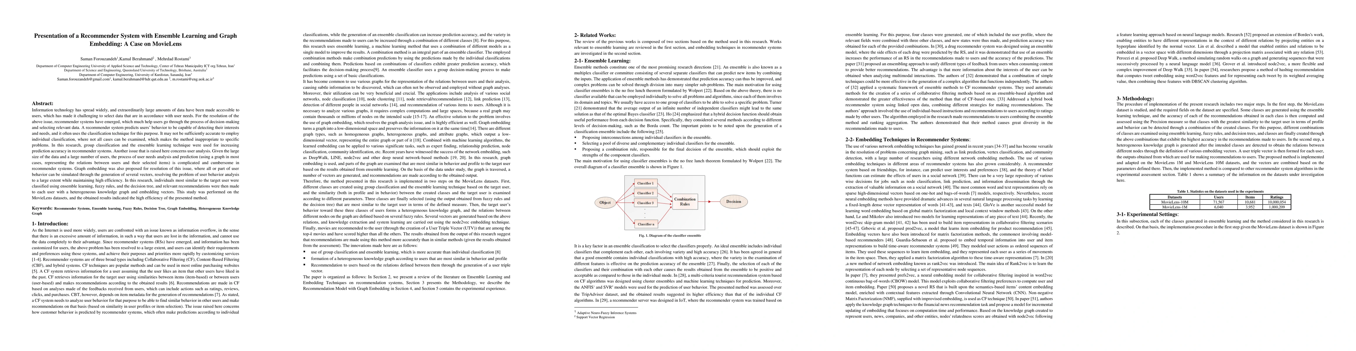 This paper presents a recommender system using ensemble learning and graph embedding to enhance prediction accuracy and user analysis. The method combines group classification, fuzzy rules, and decision trees to recommend movies on the MovieLens dataset, demonstrating high efficiency through improved user behavior simulation and recommendation accuracy.