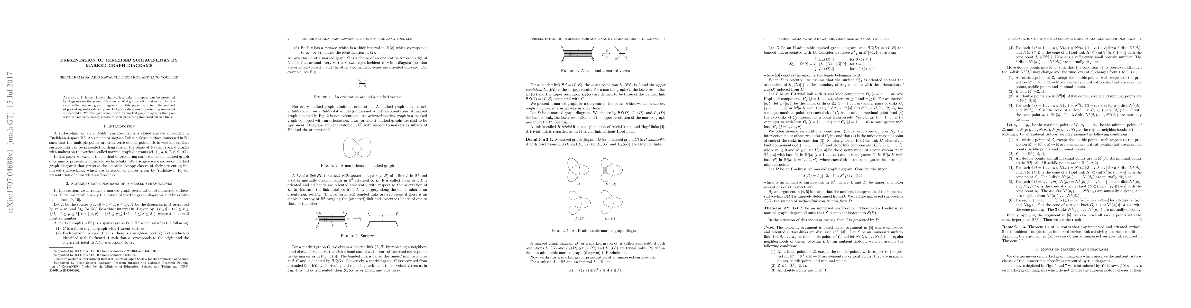 It is well known that surface-links in 4-space can be presented by diagrams on the plane of 4-valent spatial graphs with makers on the vertices, called marked graph diagrams. In this paper we extend the method of presenting surface-links by marked graph diagrams to presenting immersed surface-links. We also give some moves on marked graph diagrams that preserve the ambient isotopy classes of their presenting immersed surface-links.