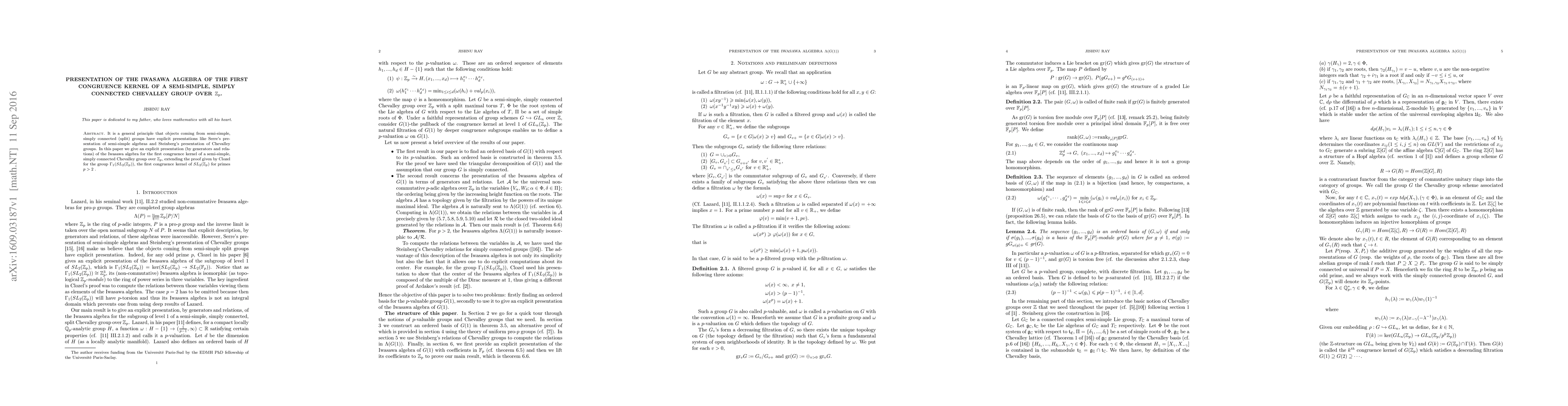 This paper presents an explicit presentation of the Iwasawa algebra for the first congruence kernel of a semi-simple, simply connected Chevalley group over $mathbb{Z}_p$, extending previous results for $SL_2(mathbb{Z}_p)$.