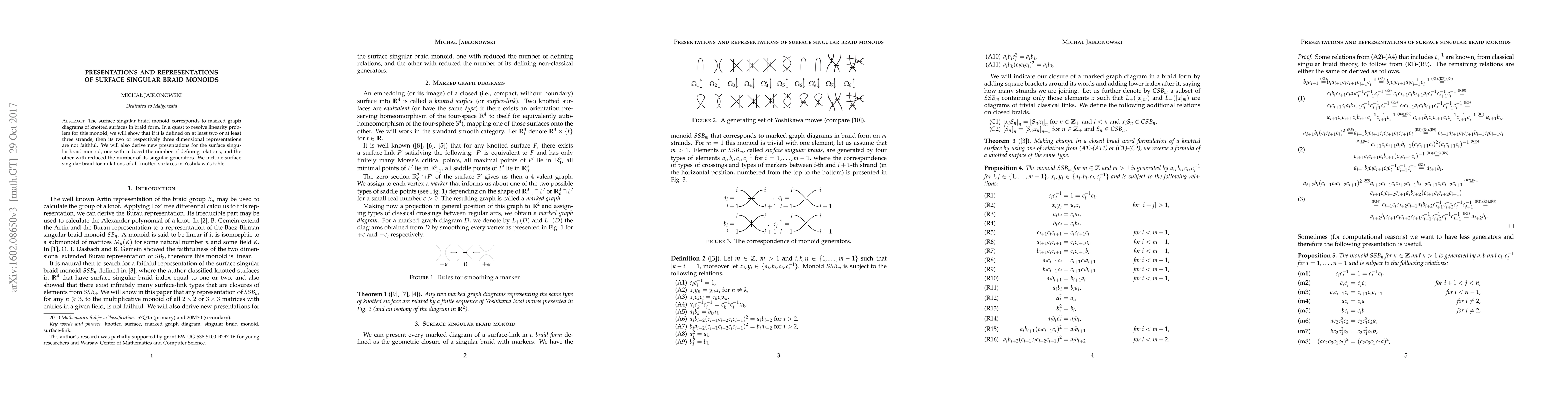 The research presents new representations for the surface singular braid monoid, demonstrating that two-dimensional representations are not faithful for two strands and three-dimensional representations for three strands. It also provides improved presentations with fewer defining relations and singular generators, along with formulations for all knotted surfaces in Yoshikawa's table.