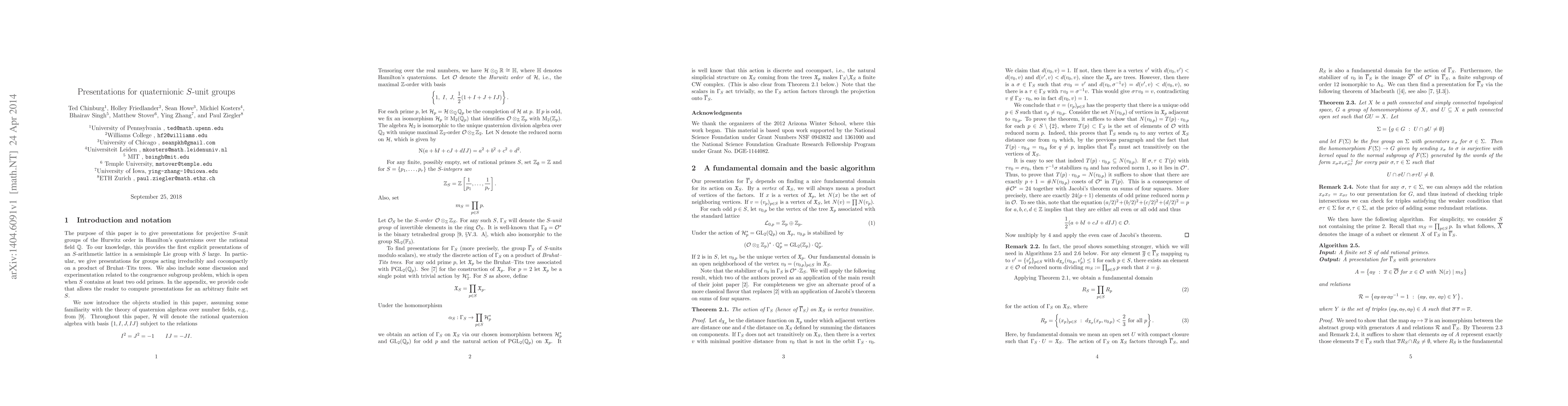 The purpose of this paper is to give presentations for projective $S$-unit groups of the Hurwitz order in Hamilton's quaternions over the rational field $\mathbb{Q}$. To our knowledge, this provides the first explicit presentations of an $S$-arithmetic lattice in a semisimple Lie group with $S$ large. In particular, we give presentations for groups acting irreducibly and cocompactly on a product of Bruhat--Tits trees. We also include some discussion and experimentation related to the congruence subgroup problem, which is open when $S$ contains at least two odd primes. In the appendix, we provide code that allows the reader to compute presentations for an arbitrary finite set $S$.