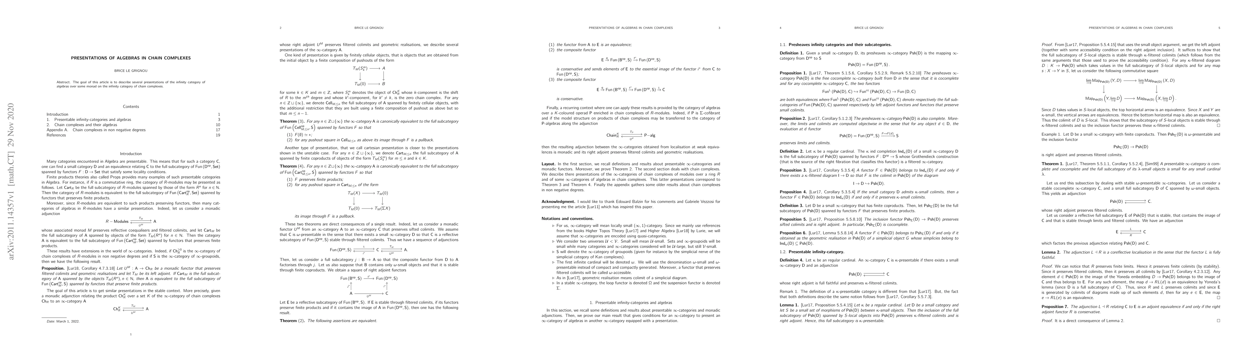 The goal of this article is to describe several presentations of the infinity category of algebras over some monad on the infinity category of chain complexes.