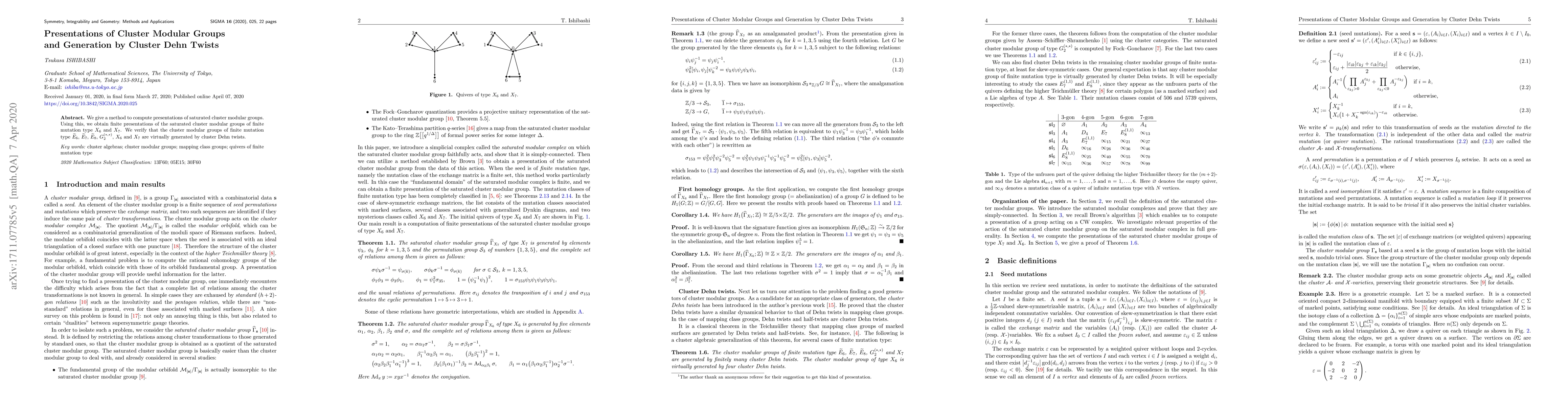 We give a method to compute presentations of saturated cluster modular groups. Using this, we obtain finite presentations of the saturated cluster modular groups of finite mutation type $X_6$ and $X_7$. We verify that the cluster modular groups of finite mutation type $\widetilde{E}_6$, $\widetilde{E}_7$, $\widetilde{E}_8$, $G_2^{(*,*)}$, $X_6$ and $X_7$ are virtually generated by cluster Dehn twists.