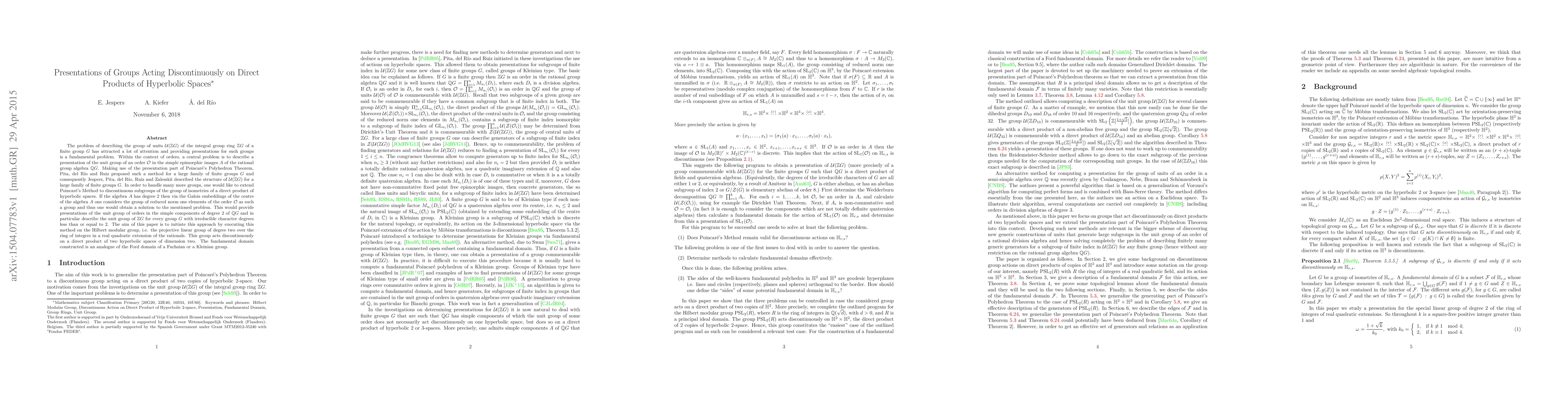 This paper explores the method of extending Poincaré's Polyhedron Theorem to discontinuous subgroups acting on direct products of hyperbolic spaces, specifically focusing on the Hilbert modular group. It aims to provide presentations for the unit group of orders in the simple components of degree 2 of the rational group algebra, thereby describing the unit group of $\mathbb{Z} G$ for groups with irreducible character degrees ≤ 2.