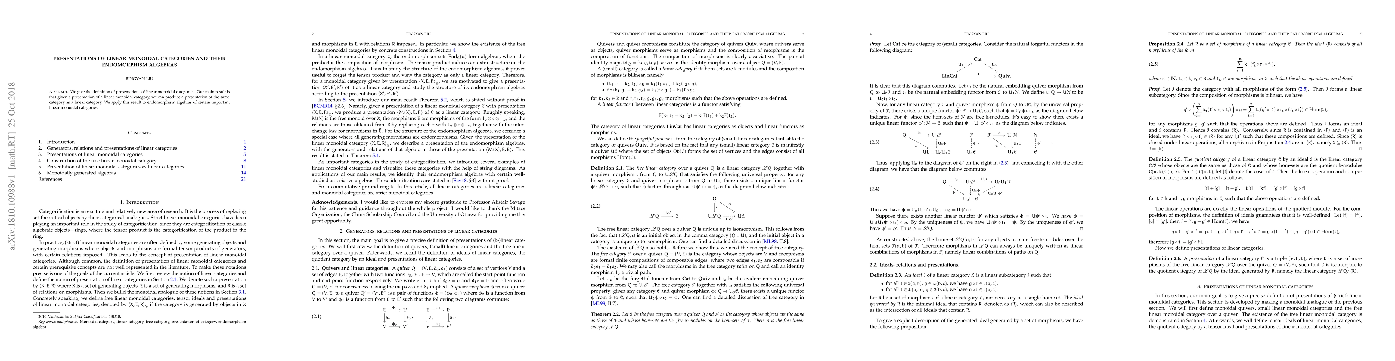 We give the definition of presentations of linear monoidal categories. Our main result is that given a presentation of a linear monoidal category, we can produce a presentation of the same category as a linear category. We apply this result to endomorphism algebras of certain important linear monoidal categories.