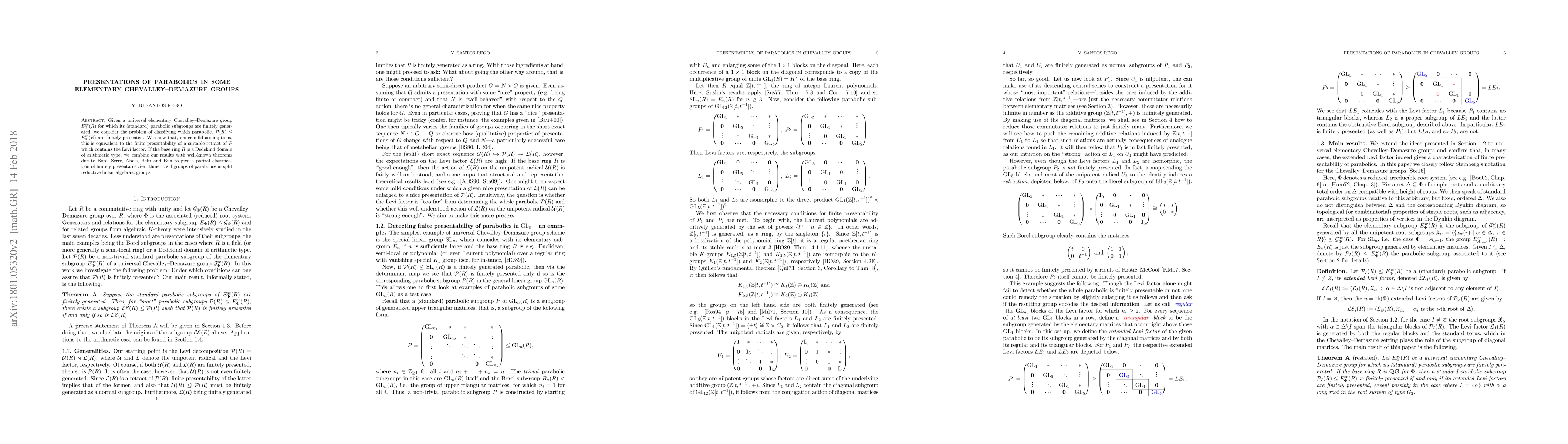 This paper classifies finitely presented parabolic subgroups within certain universal elementary Chevalley-Demazure groups. It demonstrates that such finite presentability is equivalent to that of a suitable retract containing the Levi factor, and provides a partial classification for $S$-arithmetic subgroups when the base ring is a Dedekind domain of arithmetic type.