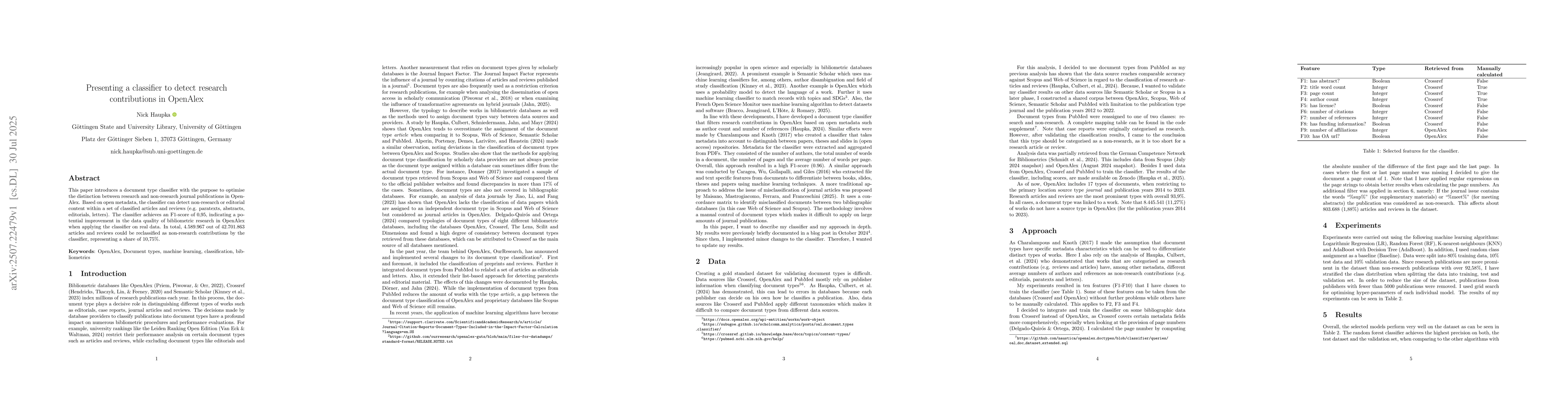 The research introduces a document type classifier using open metadata from OpenAlex to distinguish between research and non-research journal publications, employing machine learning algorithms such as k-nearest-neighbours and AdaBoost.