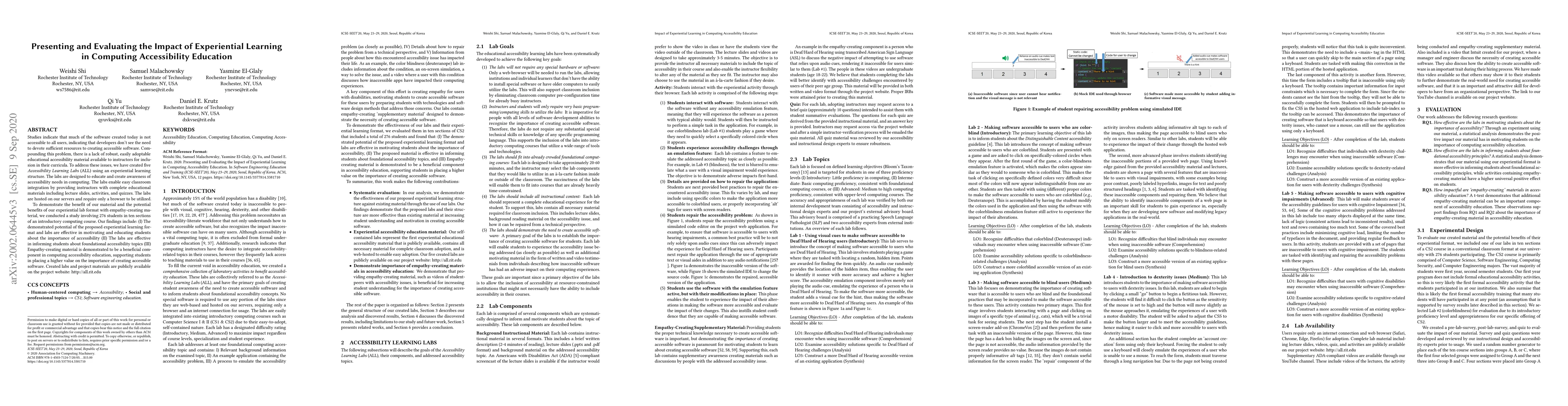 Studies indicate that much of the software created today is not accessible to all users, indicating that developers don't see the need to devote sufficient resources to creating accessible software. Compounding this problem, there is a lack of robust, easily adoptable educational accessibility material available to instructors for inclusion in their curricula. To address these issues, we have created five Accessibility Learning Labs (ALL) using an experiential learning structure. The labs are designed to educate and create awareness of accessibility needs in computing. The labs enable easy classroom integration by providing instructors with complete educational materials including lecture slides, activities, and quizzes. The labs are hosted on our servers and require only a browser to be utilized. To demonstrate the benefit of our material and the potential benefits of our experiential lab format with empathy-creating material, we conducted a study involving 276 students in ten sections of an introductory computing course. Our findings include: (I) The demonstrated potential of the proposed experiential learning format and labs are effective in motivating and educating students about the importance of accessibility (II) The labs are effective in informing students about foundational accessibility topics (III) Empathy-creating material is demonstrated to be a beneficial component in computing accessibility education, supporting students in placing a higher value on the importance of creating accessible software. Created labs and project materials are publicly available on the project website: http://all.rit.edu