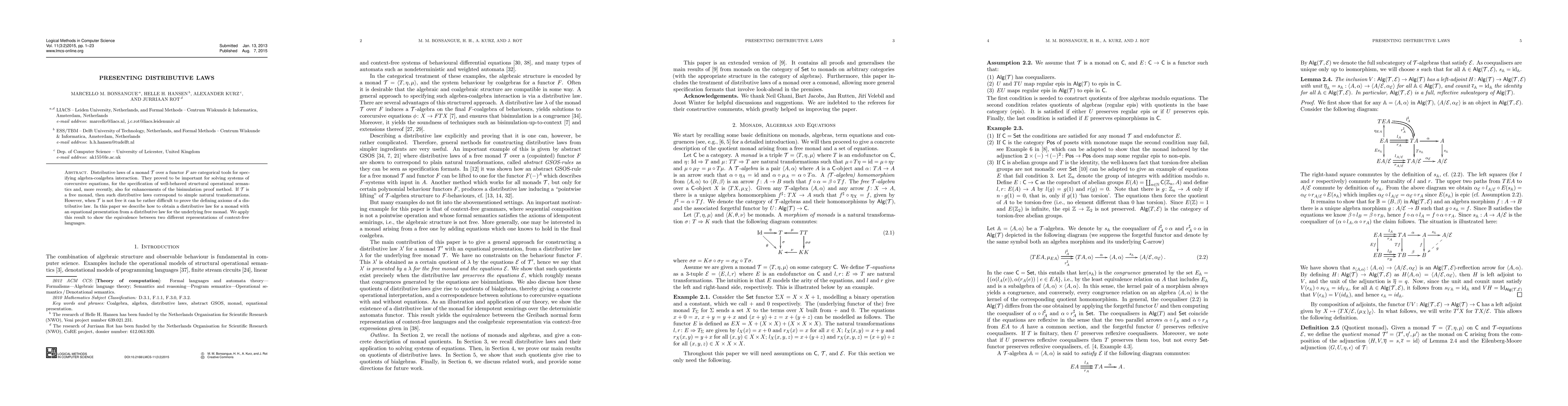 This paper introduces a method to derive distributive laws for monads with an equational presentation from those of their corresponding free monads, demonstrating its application in proving equivalences between different representations of context-free languages. The method facilitates solving corecursive equations and enhancing bisimulation proof methods.