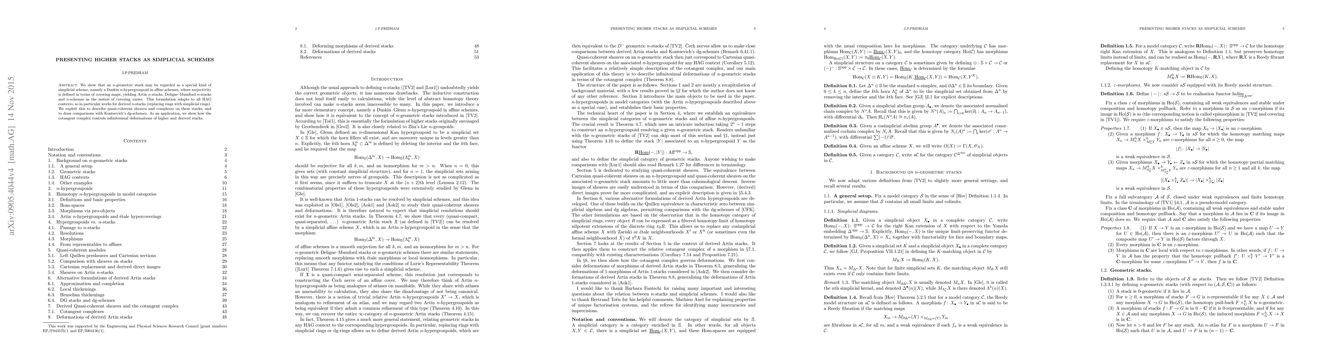 We show that an n-geometric stack may be regarded as a special kind of simplicial scheme, namely a Duskin n-hypergroupoid in affine schemes, where surjectivity is defined in terms of covering maps, yielding Artin n-stacks, Deligne-Mumford n-stacks and n-schemes as the notion of covering varies. This formulation adapts to all HAG contexts, so in particular works for derived n-stacks (replacing rings with simplicial rings). We exploit this to describe quasi-coherent sheaves and complexes on these stacks, and to draw comparisons with Kontsevich's dg-schemes. As an application, we show how the cotangent complex controls infinitesimal deformations of higher and derived stacks.