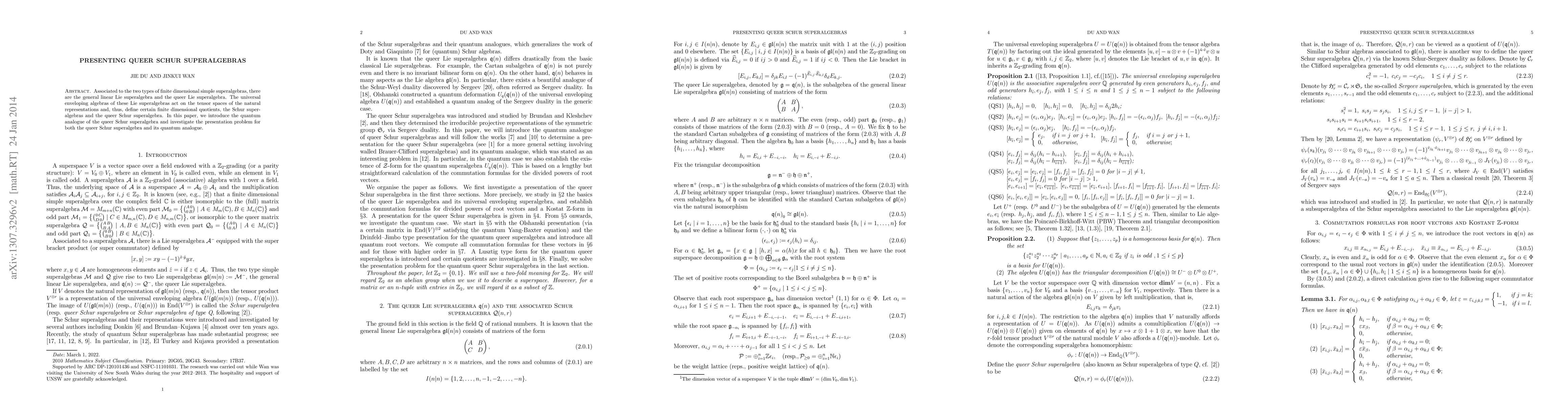 Associated to the two types of finite dimensional simple superalgebras, there are the general linear Lie superalgebra and the queer Lie superalgebra. The universal enveloping algebras of these Lie superalgebras act on the tensor spaces of the natural representations and, thus, define certain finite dimensional quotients, the Schur superalgebras and the queer Schur superalgebra. In this paper, we introduce the quantum analogue of the queer Schur superalgebra and investigate the presentation problem for both the queer Schur superalgebra and its quantum analogue.