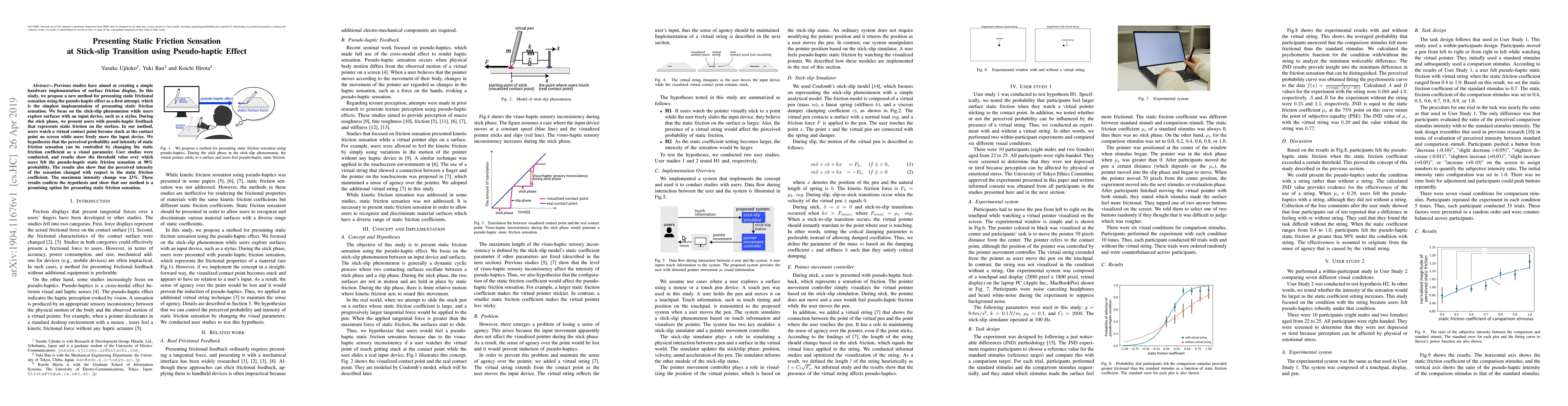 This paper proposes a method to present static friction sensation using pseudo-haptic feedback during the stick-slip transition, showing that users can perceive varying intensities of friction based on visual parameters. User studies confirmed the effectiveness of the method, with a 23% maximum intensity change observed.