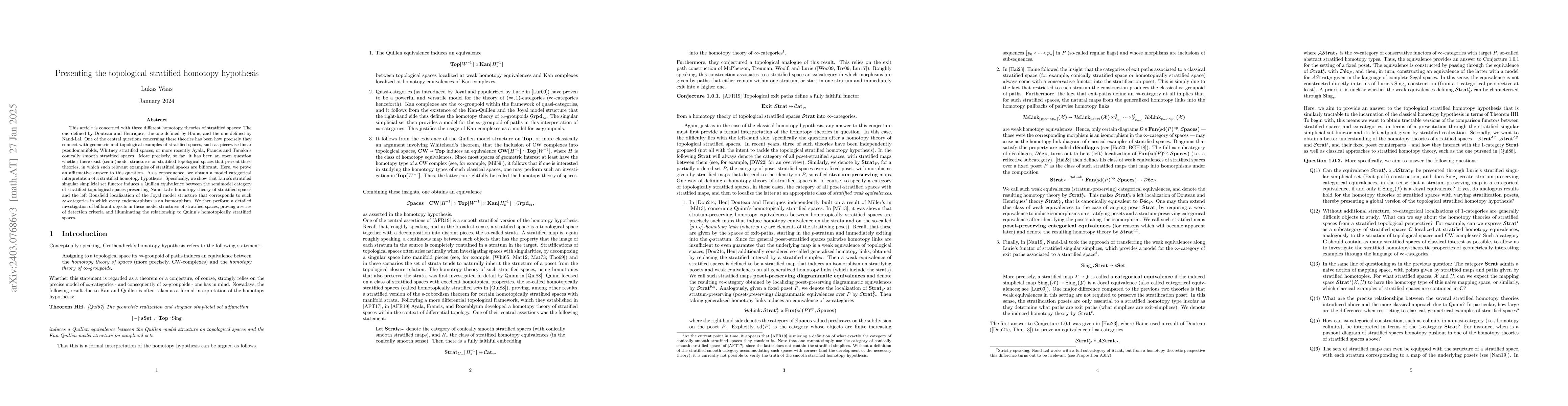 This paper establishes a model categorical framework for presenting various homotopy theories of stratified spaces, proving that these theories can be modeled by semimodel structures on stratified topological spaces. It demonstrates that Lurie's stratified singular simplicial set functor induces a Quillen equivalence, thus supporting a stratified homotopy hypothesis.