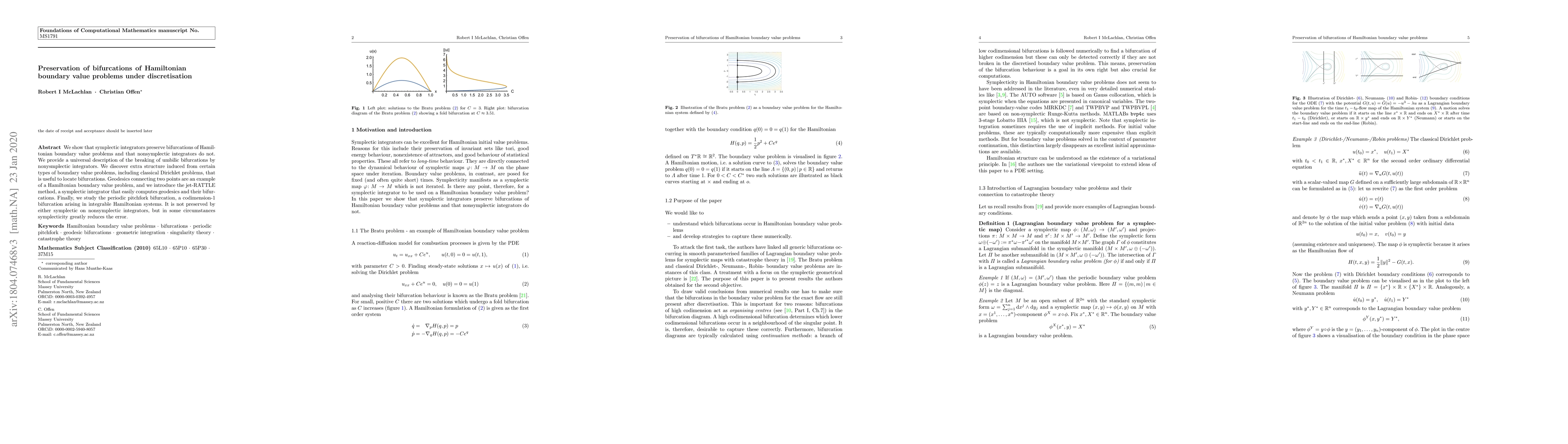 This paper demonstrates that symplectic integrators maintain bifurcations in Hamiltonian boundary value problems, unlike nonsymplectic ones, and introduces the jet-RATTLE method for computing geodesics and their bifurcations. It also explores the periodic pitchfork bifurcation, noting that while neither type of integrator preserves it perfectly, symplecticity minimizes error.