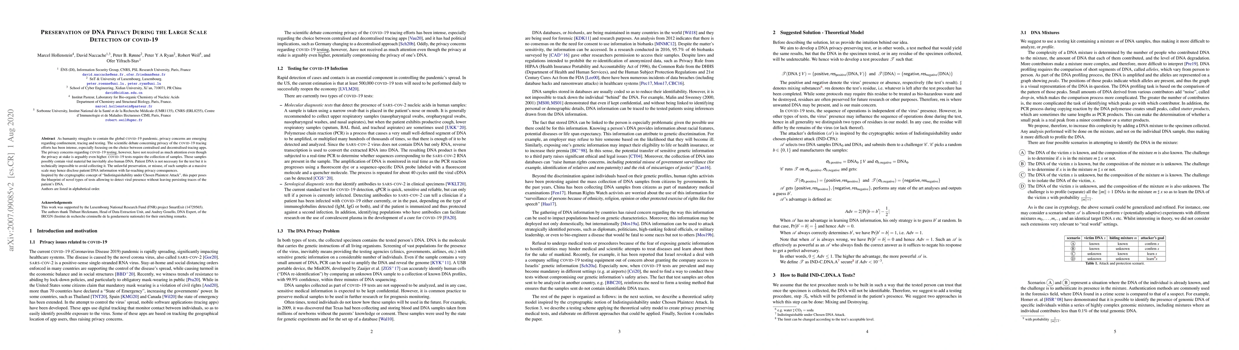 As humanity struggles to contain the global COVID-19 pandemic, privacy concerns are emerging regarding confinement, tracing and testing. The scientific debate concerning privacy of the COVID-19 tracing efforts has been intense, especially focusing on the choice between centralised and decentralised tracing apps. The privacy concerns regarding COVID-19 testing, however, have not received as much attention even though the privacy at stake is arguably even higher. COVID-19 tests require the collection of samples. Those samples possibly contain viral material but inevitably also human DNA. Patient DNA is not necessary for the test but it is technically impossible to avoid collecting it. The unlawful preservation, or misuse, of such samples at a massive scale may hence disclose patient DNA information with far-reaching privacy consequences. Inspired by the cryptographic concept of "Indistinguishability under Chosen Plaintext Attack", this paper poses the blueprint of novel types of tests allowing to detect viral presence without leaving persisting traces of the patient's DNA. Authors are listed in alphabetical order.