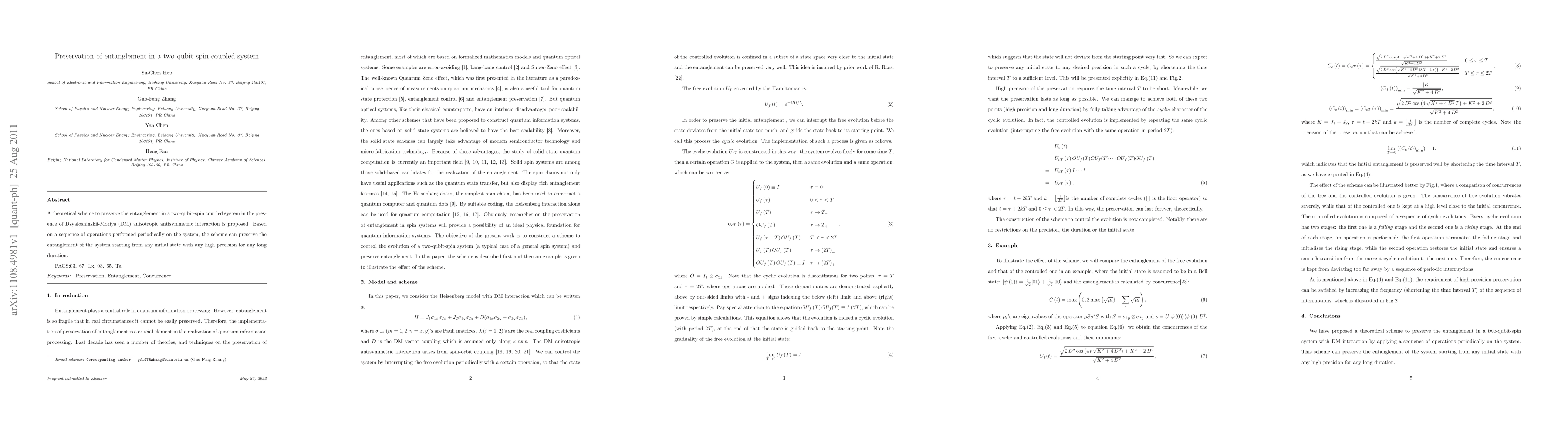 This paper proposes a theoretical scheme to preserve entanglement in a two-qubit-spin coupled system using Dzyaloshinskii-Moriya interaction, ensuring high-precision preservation over long durations through periodic operations. The method works for any initial state.