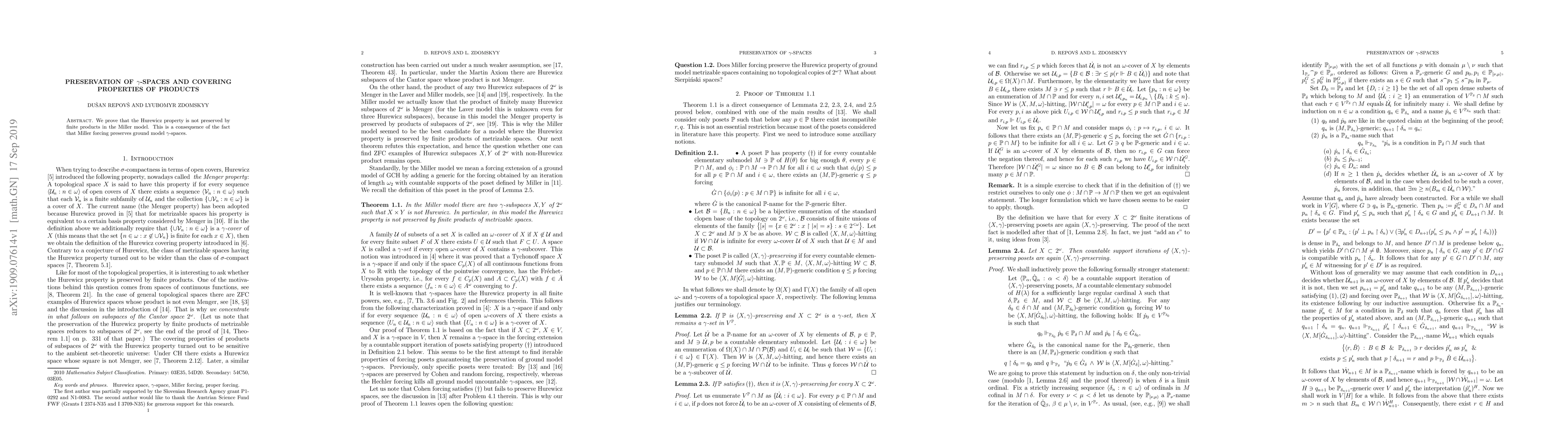 Summary: The paper demonstrates that the Hurewicz property fails in finite products within the Miller model, due to Miller forcing preserving ground model $\gamma$-spaces. This finding highlights a non-preservation issue in covering properties of product spaces.