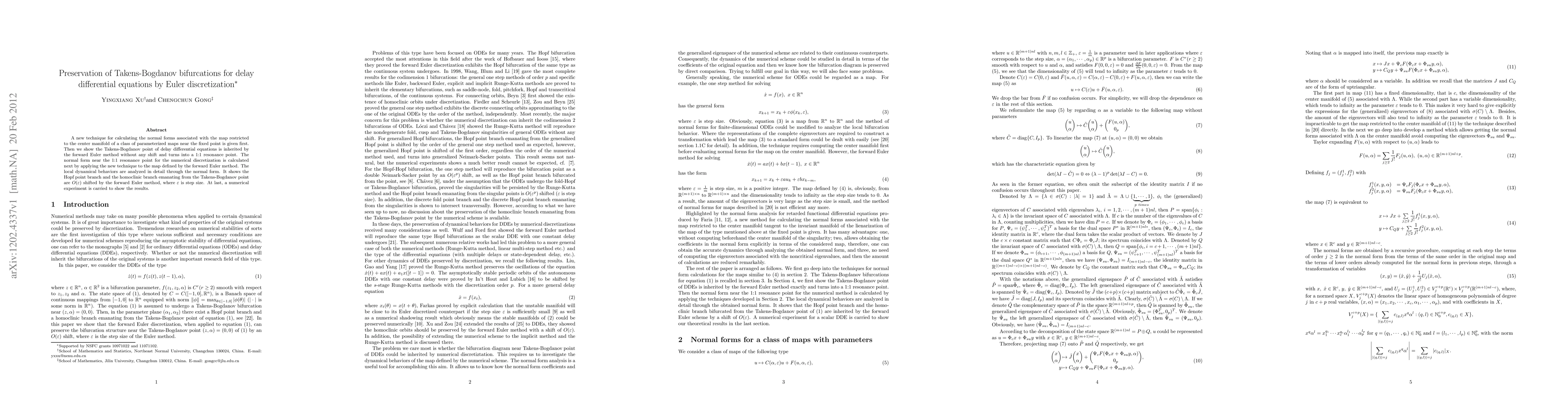 A new technique for calculating the normal forms associated with the map restricted to the center manifold of a class of parameterized maps near the fixed point is given first. Then we show the Takens-Bogdanov point of delay differential equations is inherited by the forward Euler method without any shift and turns into a 1:1 resonance point. The normal form near the 1:1 resonance point for the numerical discretization is calculated next by applying the new technique to the map defined by the forward Euler method. The local dynamical behaviors are analyzed in detail through the normal form. It shows the Hopf point branch and the homoclinic branch emanating from the Takens-Bogdanov point are $O(\varepsilon)$ shifted by the forward Euler method, where $\varepsilon$ is step size. At last, a numerical experiment is carried to show the results.