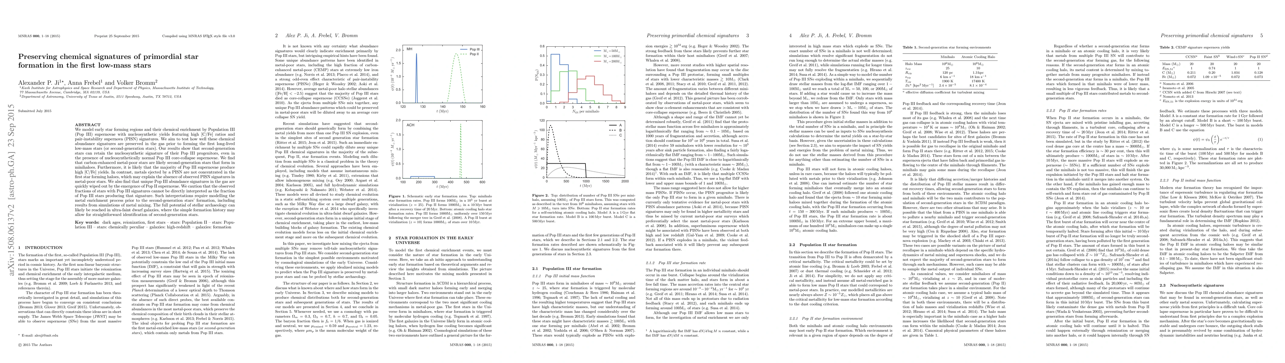 This paper models the chemical enrichment from Population III supernovae in early star-forming regions, showing that second-generation low-mass stars retain the nucleosynthetic signatures of their Pop III progenitors, especially high [C/Fe] ratios. It concludes that carbon-enhanced metal-poor stars likely originate from these first-generation stars, but the unique signatures from pair-instability supernovae are not preserved in the gas.