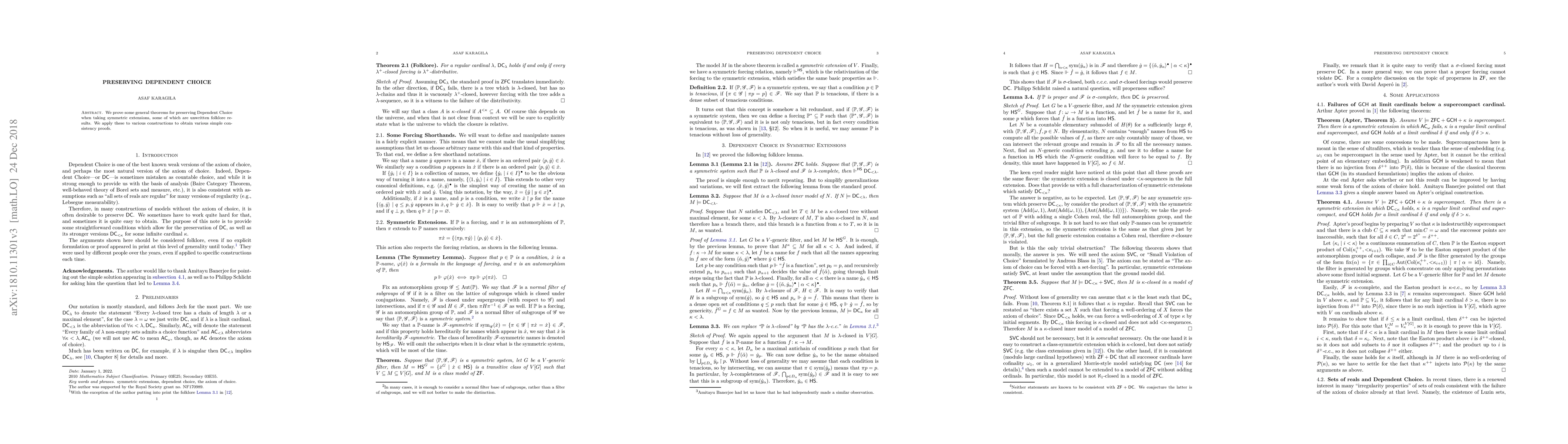 This paper proves general theorems for preserving Dependent Choice in symmetric extensions, providing simple consistency proofs through various constructions.