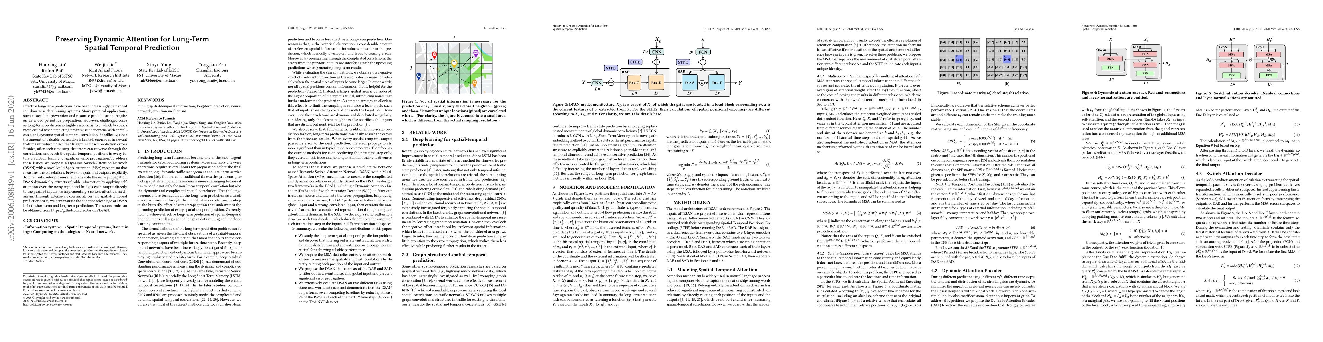 Effective long-term predictions have been increasingly demanded in urban-wise data mining systems. Many practical applications, such as accident prevention and resource pre-allocation, require an extended period for preparation. However, challenges come as long-term prediction is highly error-sensitive, which becomes more critical when predicting urban-wise phenomena with complicated and dynamic spatial-temporal correlation. Specifically, since the amount of valuable correlation is limited, enormous irrelevant features introduce noises that trigger increased prediction errors. Besides, after each time step, the errors can traverse through the correlations and reach the spatial-temporal positions in every future prediction, leading to significant error propagation. To address these issues, we propose a Dynamic Switch-Attention Network (DSAN) with a novel Multi-Space Attention (MSA) mechanism that measures the correlations between inputs and outputs explicitly. To filter out irrelevant noises and alleviate the error propagation, DSAN dynamically extracts valuable information by applying self-attention over the noisy input and bridges each output directly to the purified inputs via implementing a switch-attention mechanism. Through extensive experiments on two spatial-temporal prediction tasks, we demonstrate the superior advantage of DSAN in both short-term and long-term predictions.