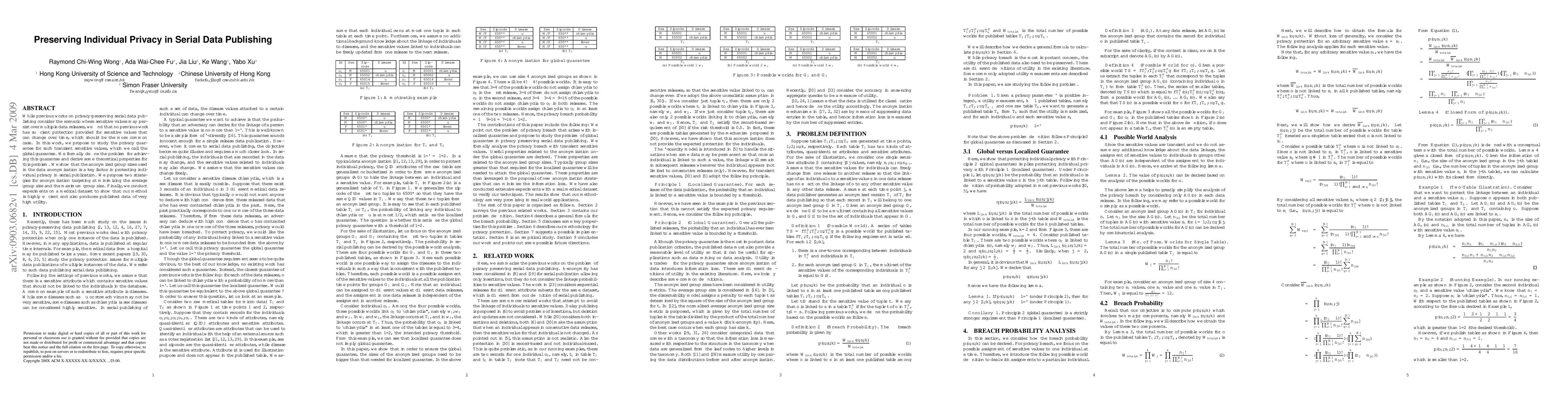 This paper proposes a novel approach to preserving privacy for transient sensitive values in serial data publishing, introducing the concept of "global guarantee." It presents two anonymization strategies to minimize group sizes and demonstrates their efficiency and high utility through experiments on a medical dataset.