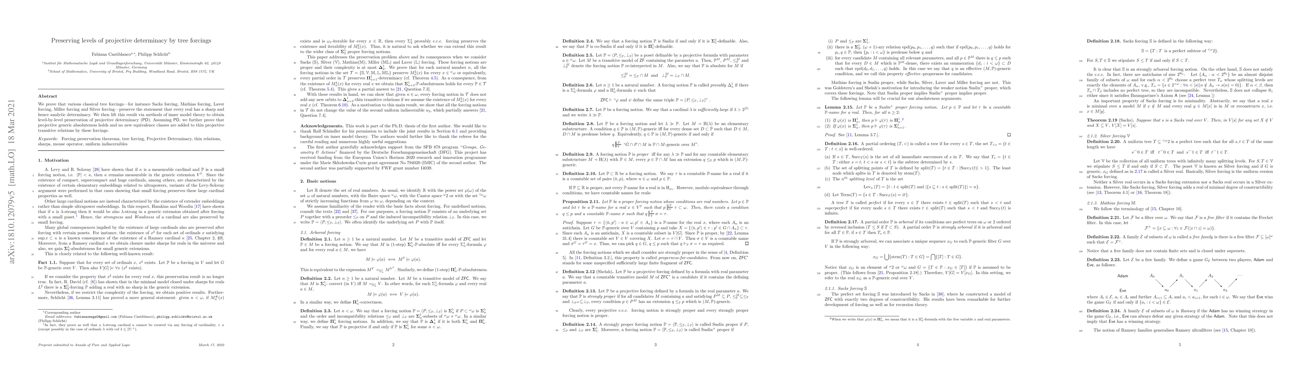 This paper demonstrates that several classical tree forcings preserve projective determinacy (PD) and proves that these forcings do not introduce new equivalence classes to thin projective transitive relations, ensuring projective generic absoluteness holds under PD.