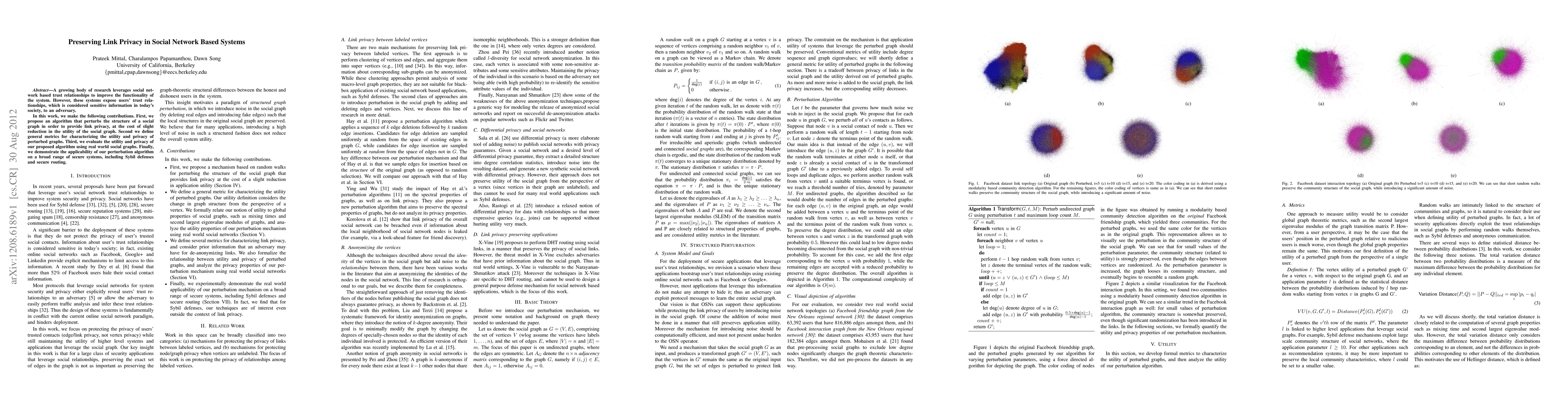 A growing body of research leverages social network based trust relationships to improve the functionality of the system. However, these systems expose users' trust relationships, which is considered sensitive information in today's society, to an adversary. In this work, we make the following contributions. First, we propose an algorithm that perturbs the structure of a social graph in order to provide link privacy, at the cost of slight reduction in the utility of the social graph. Second we define general metrics for characterizing the utility and privacy of perturbed graphs. Third, we evaluate the utility and privacy of our proposed algorithm using real world social graphs. Finally, we demonstrate the applicability of our perturbation algorithm on a broad range of secure systems, including Sybil defenses and secure routing.