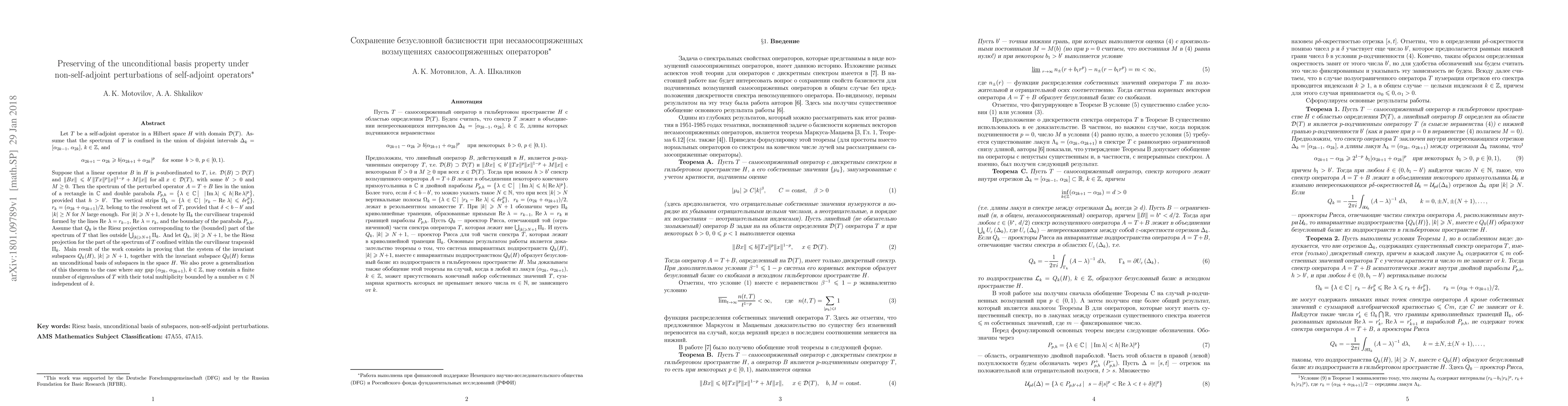A self-adjoint operator T with spectrum confined to disjoint intervals is perturbed by a linear operator B, resulting in an operator A with spectrum lying within a specific parabolic region. The resolvent set of T is preserved under this perturbation, and the invariant subspaces form an unconditional basis of subspaces in the Hilbert space H.