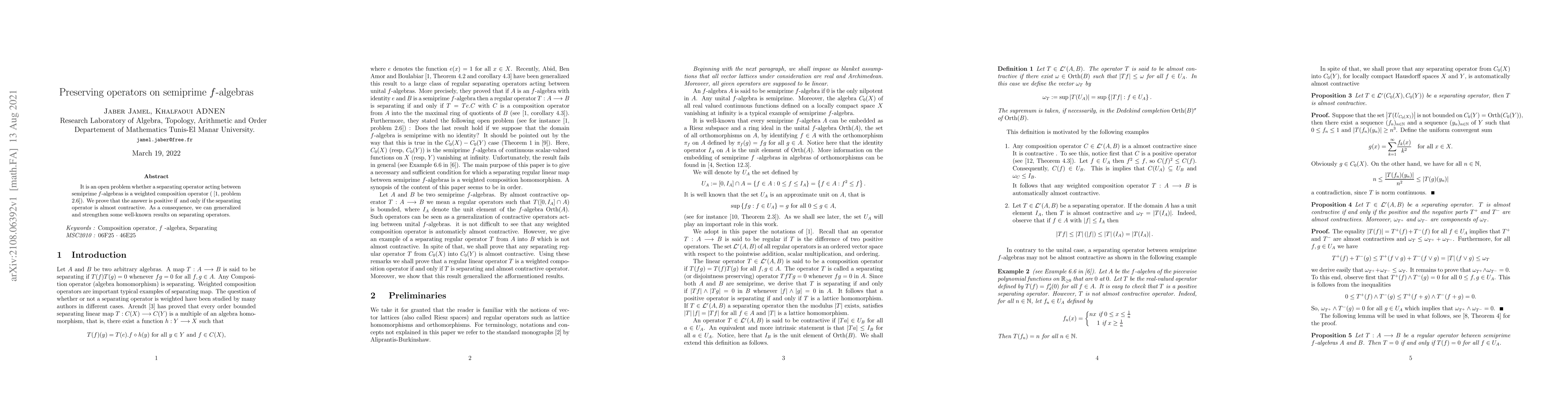 It is an open problem whether a separating operator acting between semiprime f-algebras is a weighted composition operator ( AAB). We prove that the answer is positive if and only if the separating operator is almost contractive. As a consequence, we can generalized and strengthen some well-known results on separating operators.