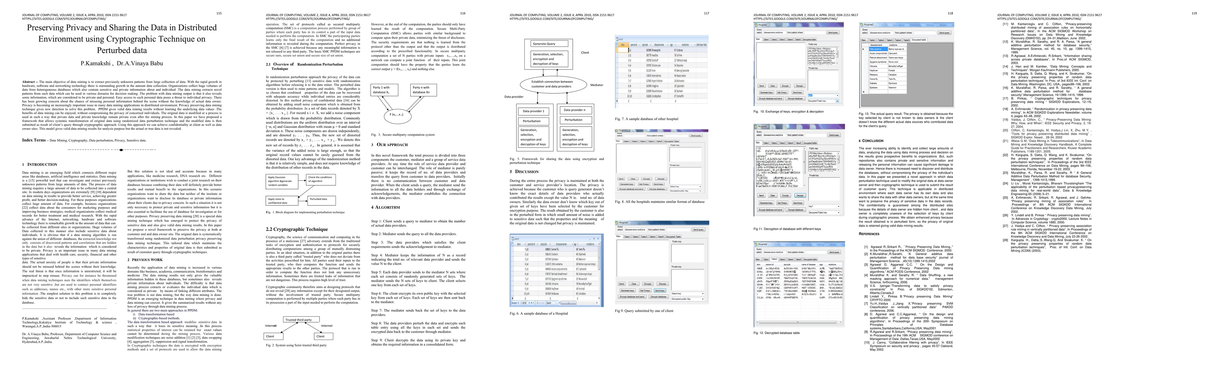The main objective of data mining is to extract previously unknown patterns from large collection of data. With the rapid growth in hardware, software and networking technology there is outstanding growth in the amount data collection. Organizations collect huge volumes of data from heterogeneous databases which also contain sensitive and private information about and individual .The data mining extracts novel patterns from such data which can be used in various domains for decision making .The problem with data mining output is that it also reveals some information, which are considered to be private and personal. Easy access to such personal data poses a threat to individual privacy. There has been growing concern about the chance of misusing personal information behind the scene without the knowledge of actual data owner. Privacy is becoming an increasingly important issue in many data mining applications in distributed environment. Privacy preserving data mining technique gives new direction to solve this problem. PPDM gives valid data mining results without learning the underlying data values .The benefits of data mining can be enjoyed, without compromising the privacy of concerned individuals. The original data is modified or a process is used in such a way that private data and private knowledge remain private even after the mining process. In this paper we have proposed a framework that allows systemic transformation of original data using randomized data perturbation technique and the modified data is then submitted as result of client's query through cryptographic approach. Using this approach we can achieve confidentiality at client as well as data owner sites. This model gives valid data mining results for analysis purpose but the actual or true data is not revealed.