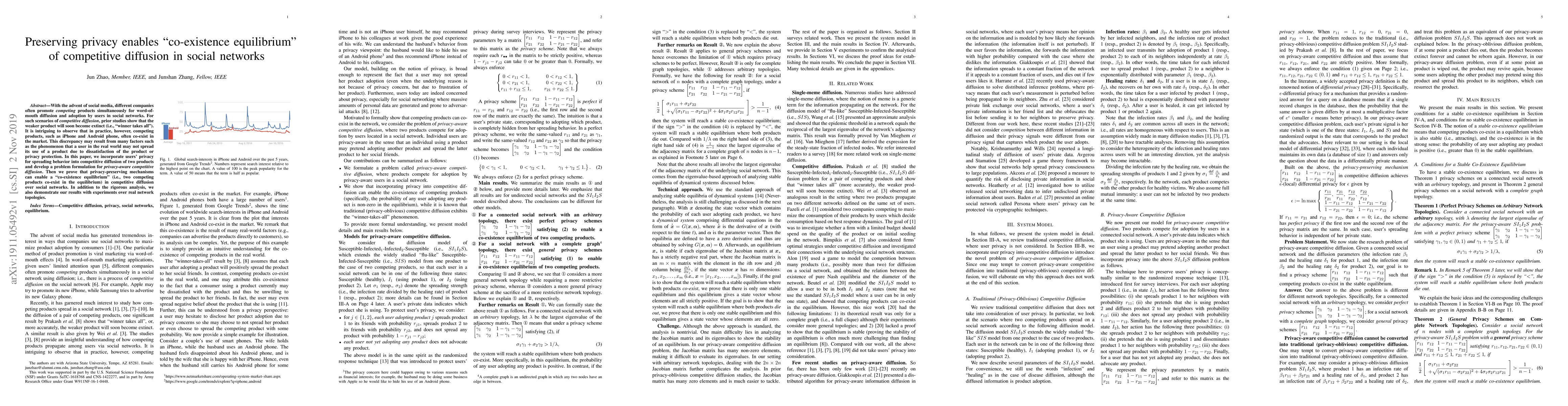 This paper explores how privacy-preserving mechanisms can enable a "coexistence equilibrium" in competitive diffusion of products in social networks, demonstrating that such mechanisms can allow two competing products to coexist rather than the "winner takes all" scenario typically observed. Experimental results on real network topologies support the theoretical findings.