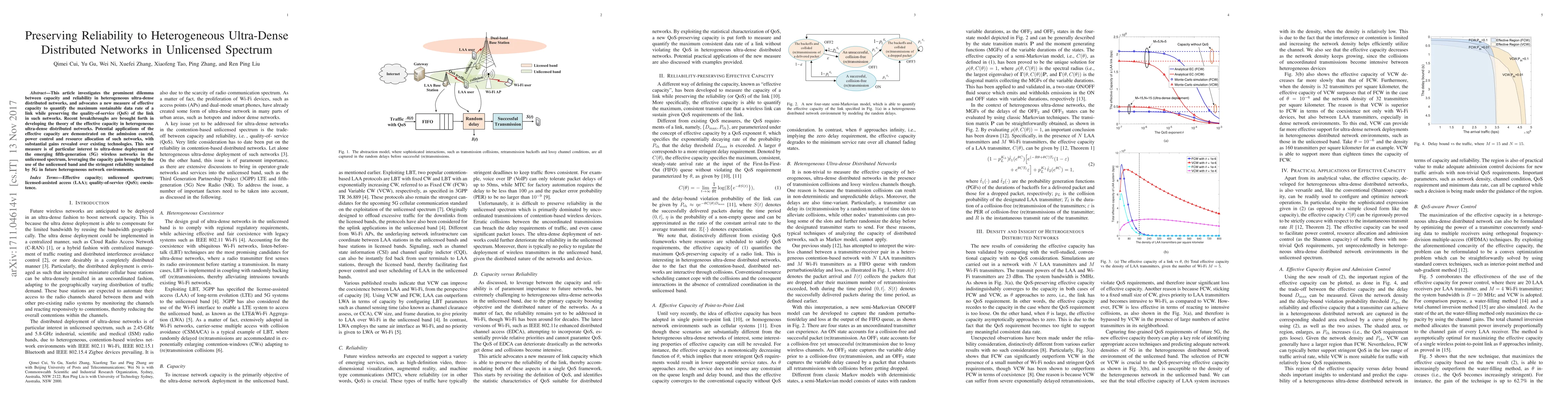This paper proposes a new measure of effective capacity to balance capacity and reliability in ultra-dense distributed networks, demonstrating significant improvements in admission control, power control, and resource allocation. It highlights the potential for 5G networks to leverage unlicensed spectrum for enhanced reliability and capacity.