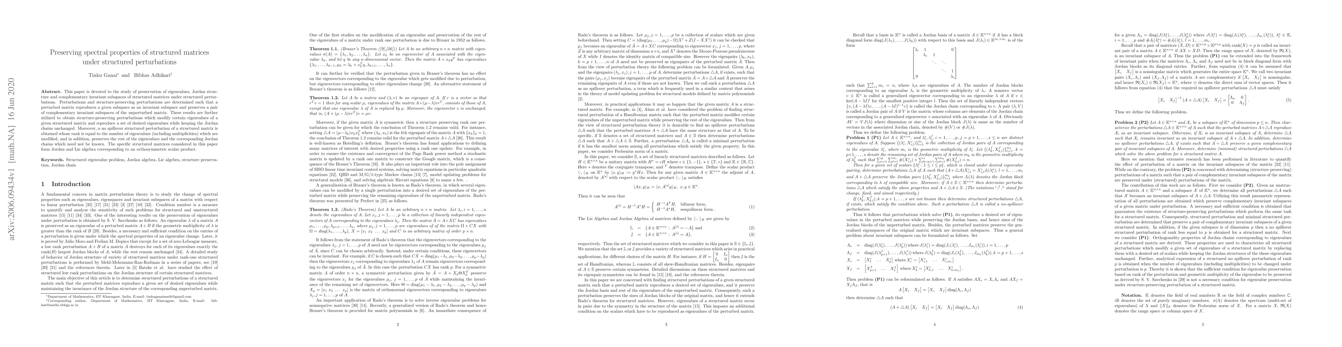 This paper investigates the preservation of eigenvalues, Jordan structure, and invariant subspaces of structured matrices under structured perturbations. It introduces methods to modify specific eigenvalues while maintaining the rest of the eigenvalues and Jordan chains, particularly for matrices associated with Jordan and Lie algebras.