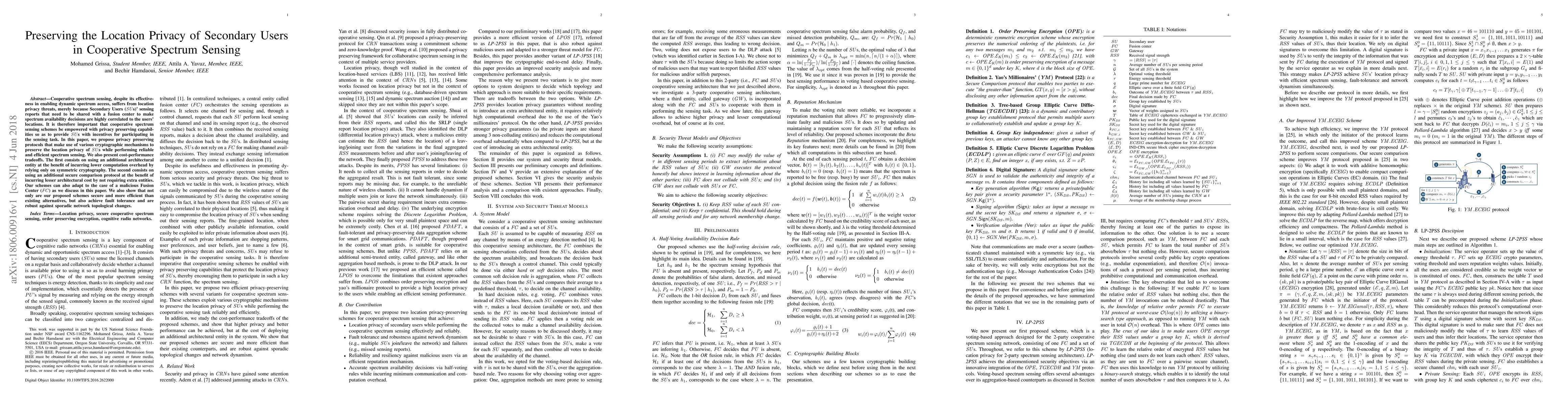 This paper proposes privacy-preserving protocols for cooperative spectrum sensing that utilize cryptographic techniques to protect the location privacy of secondary users. The proposed schemes balance security and efficiency, offering cost-performance tradeoffs and demonstrating robustness against network changes and potential fusion center malfeasance.