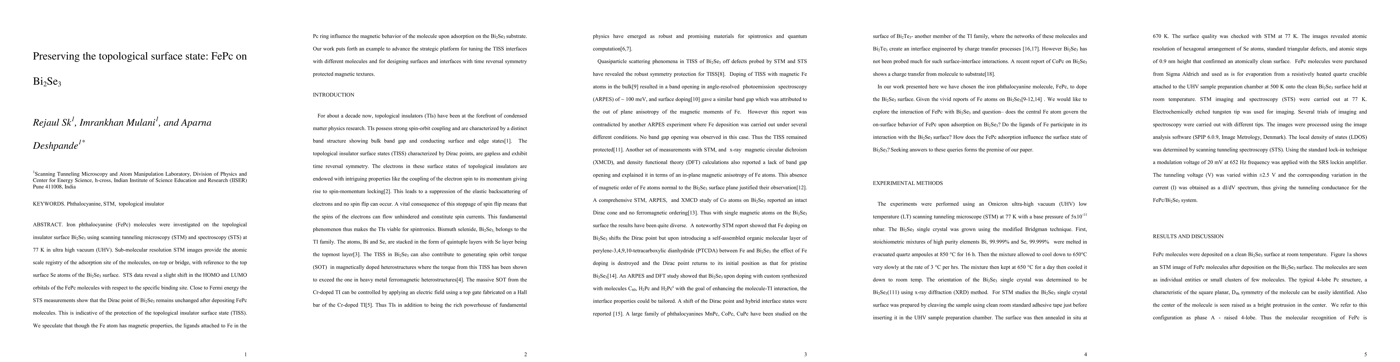 Researchers studied how iron phthalocyanine molecules affect the top surface of a topological insulator called Bi2Se3, finding that the Dirac point remains unchanged after deposition, indicating protection of the surface state.