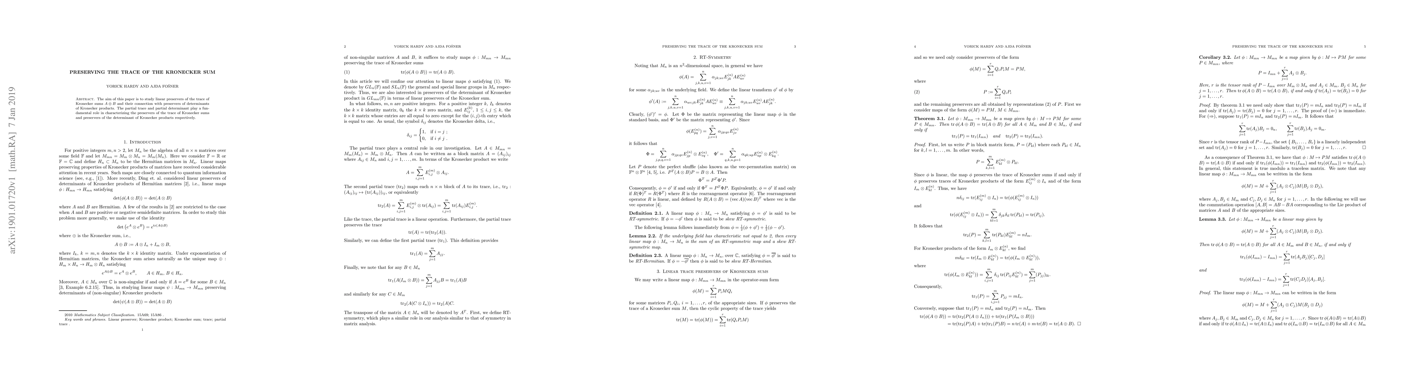 This paper investigates linear transformations that preserve the trace of Kronecker sums and explores their relationship with transformations that preserve the determinant of Kronecker products, with a focus on the roles of partial trace and partial determinant in these characterizations.