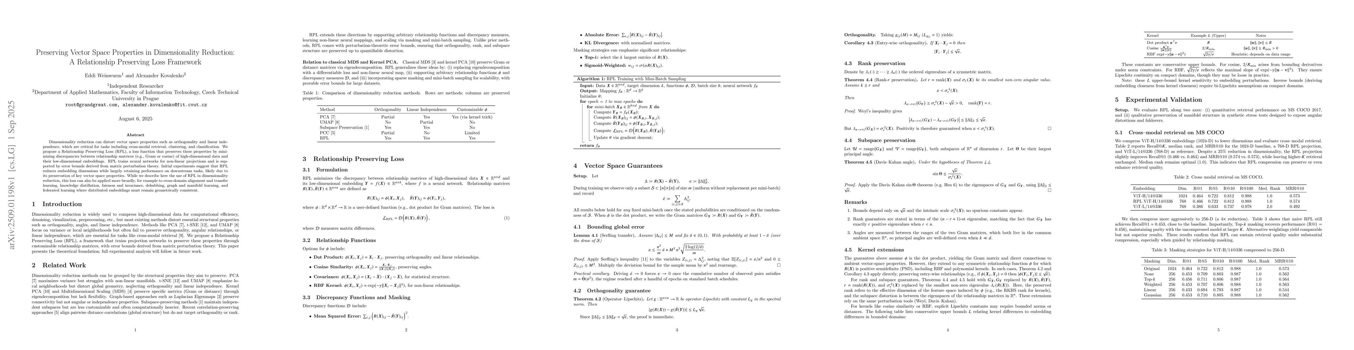 Dimensionality reduction can distort vector space properties such as orthogonality and linear independence, which are critical for tasks including cross-modal retrieval, clustering, and classification. We propose a Relationship Preserving Loss (RPL), a loss function that preserves these properties by minimizing discrepancies between relationship matrices (e.g., Gram or cosine) of high-dimensional data and their low-dimensional embeddings. RPL trains neural networks for non-linear projections and is supported by error bounds derived from matrix perturbation theory. Initial experiments suggest that RPL reduces embedding dimensions while largely retaining performance on downstream tasks, likely due to its preservation of key vector space properties. While we describe here the use of RPL in dimensionality reduction, this loss can also be applied more broadly, for example to cross-domain alignment and transfer learning, knowledge distillation, fairness and invariance, dehubbing, graph and manifold learning, and federated learning, where distributed embeddings must remain geometrically consistent.