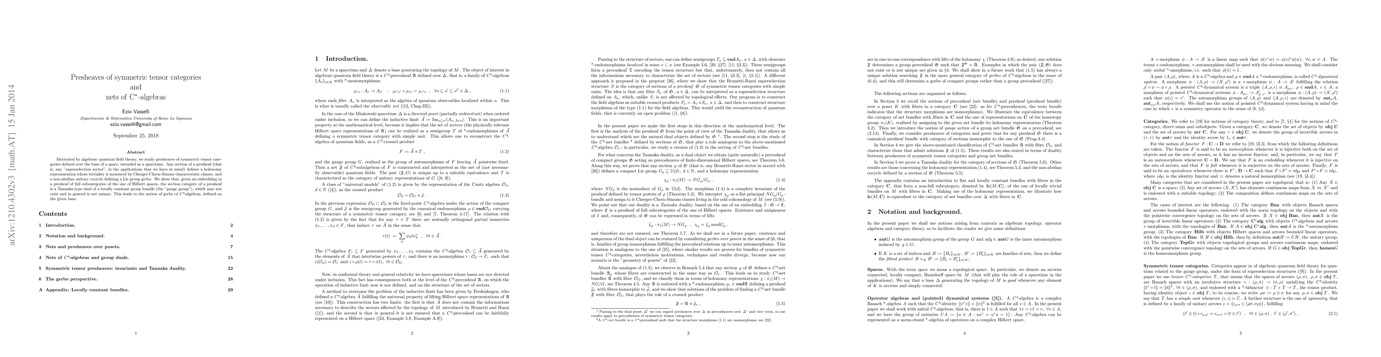 Motivated by algebraic quantum field theory, we study presheaves of symmetric tensor categories defined over the base of a space, intended as a spacetime. Any section of a presheaf (that is, any "superselection sector", in the applications that we have in mind) defines a holonomy representation whose triviality is measured by Cheeger-Chern-Simons characteristic classes, and a non-abelian unitary cocycle defining a Lie group gerbe. We show that, given an embedding in a presheaf of full subcategories of the one of Hilbert spaces, the section category of a presheaf is a Tannaka-type dual of a locally constant group bundle (the "gauge group"), which may not exist and in general is not unique. This leads to the notion of gerbe of C*-algebras, defined on the given base.