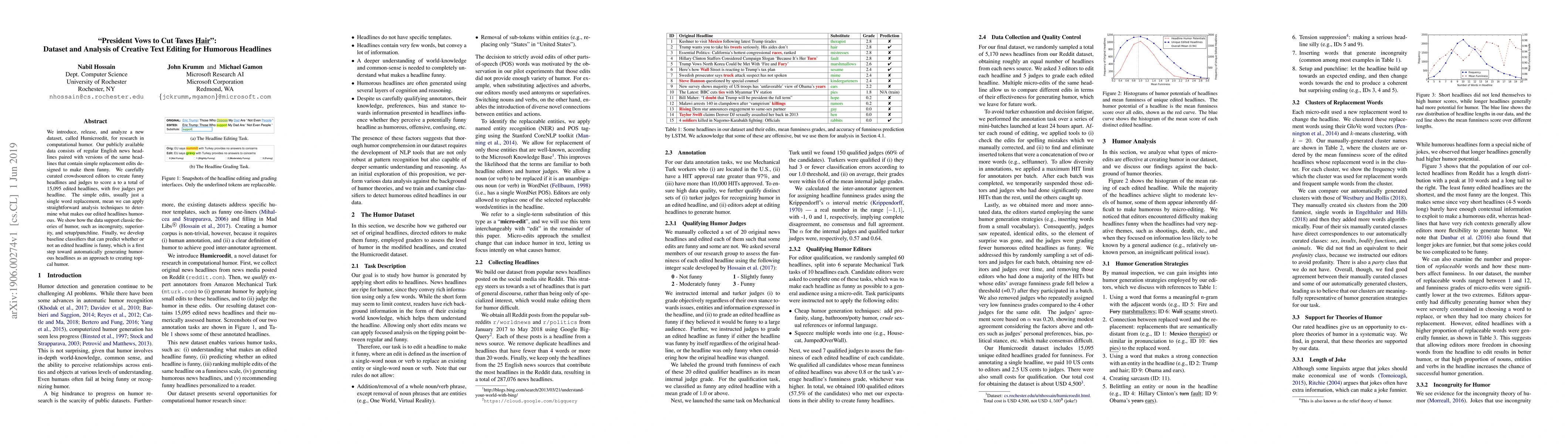 We introduce, release, and analyze a new dataset, called Humicroedit, for research in computational humor. Our publicly available data consists of regular English news headlines paired with versions of the same headlines that contain simple replacement edits designed to make them funny. We carefully curated crowdsourced editors to create funny headlines and judges to score a to a total of 15,095 edited headlines, with five judges per headline. The simple edits, usually just a single word replacement, mean we can apply straightforward analysis techniques to determine what makes our edited headlines humorous. We show how the data support classic theories of humor, such as incongruity, superiority, and setup/punchline. Finally, we develop baseline classifiers that can predict whether or not an edited headline is funny, which is a first step toward automatically generating humorous headlines as an approach to creating topical humor.